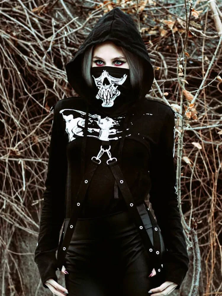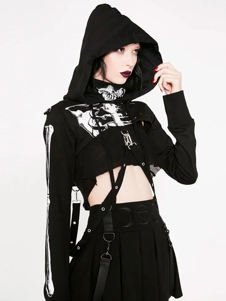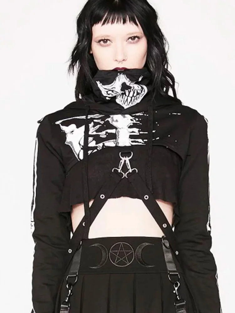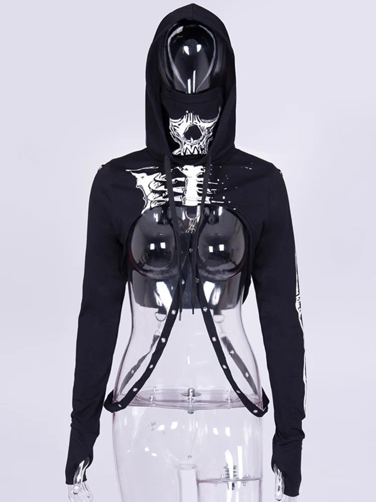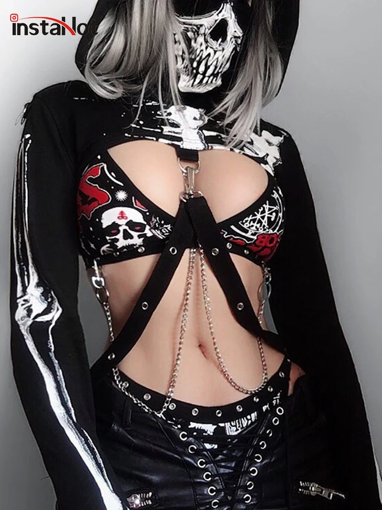 Женский топ с капюшоном InstaHot, черный укороченный топ с принтом скелета, с длинным рукавом, в готическом стиле, на Хэллоуин, 2019