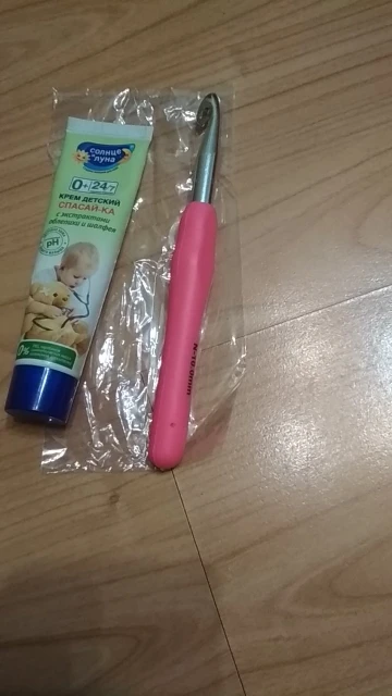 Удобный крючок и удобная ручка. Буду заказывать ещё. Доставка была в совмещённой посылке. Крючок был упакован в почтовый пакет и всё.