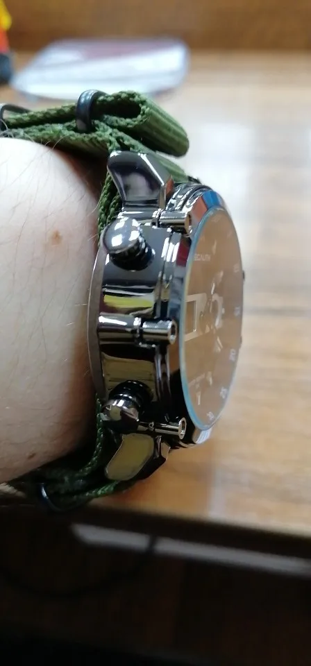 часы хорошие, большие, тяжёлые, то что надо. все функции работают, в темноте светиться указатели сколько часов показывает. Сумка в комплекте, прикольная, удобно очень Очень жаль, что нету ремешка металлического к ним, смотрелось бы просто шикарно. Я доволен