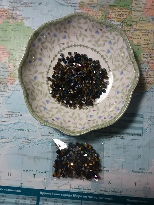 Бусинки вроде бы из стекла, очень офхигенно блестят, по количеству совпадает, даже чуть больше.