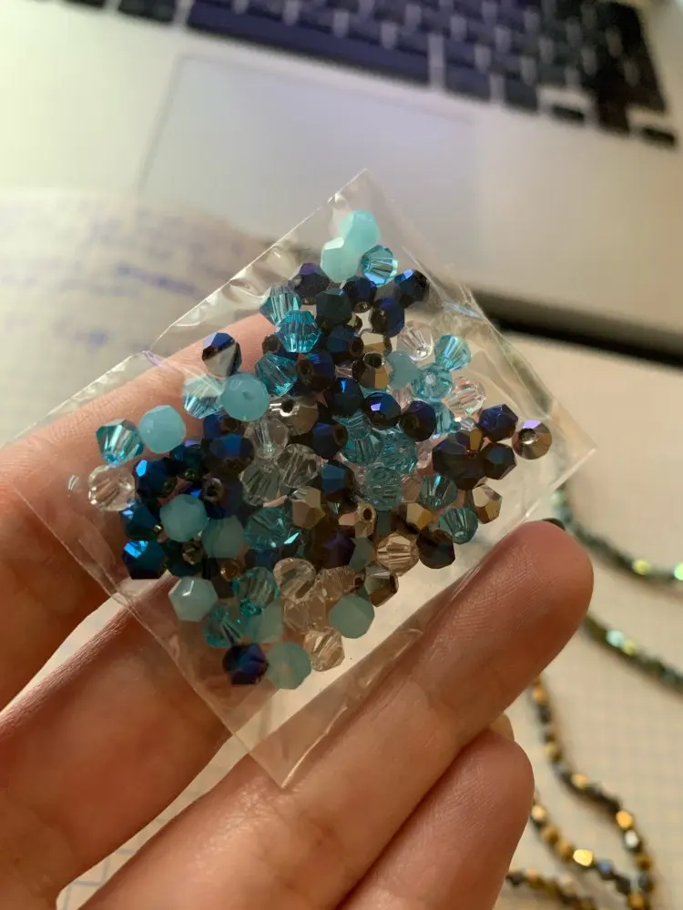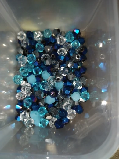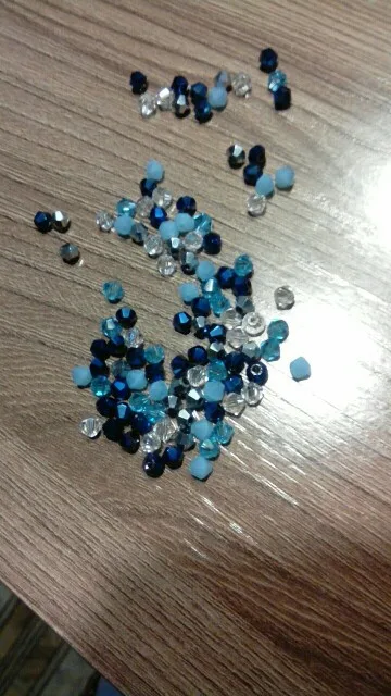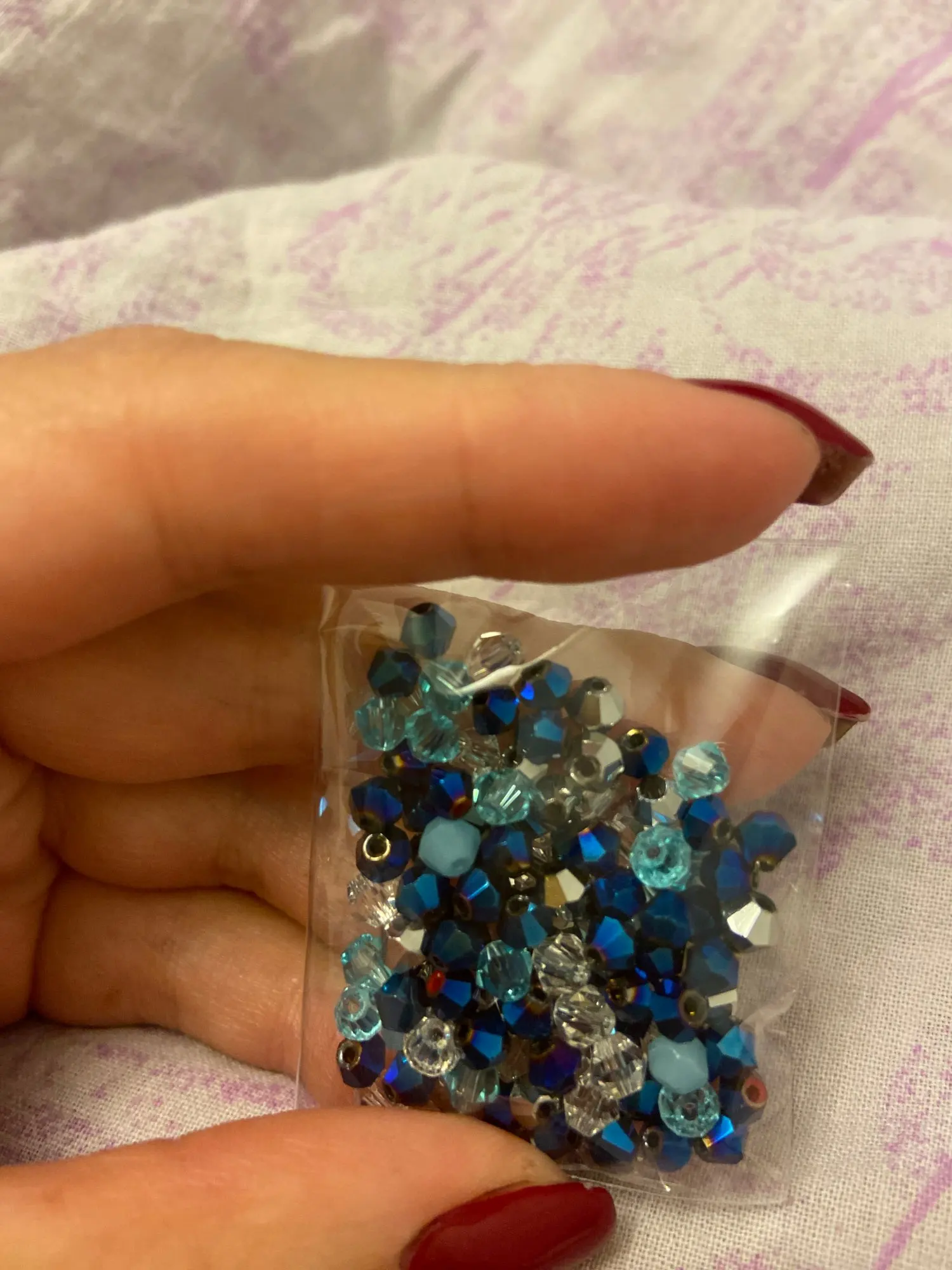 очень быстрая посылка!18 дней!я не ждала так рано! в одном пакетике 103 бусины. тёмно-синих голографических больше всего-28. серебристых и голубых прозрачных-меньше всего по 16 и 14 штук. тяжёлые, стеклянные, без сколов и повреждений. огромное спасибо продавцу! рекомендую!