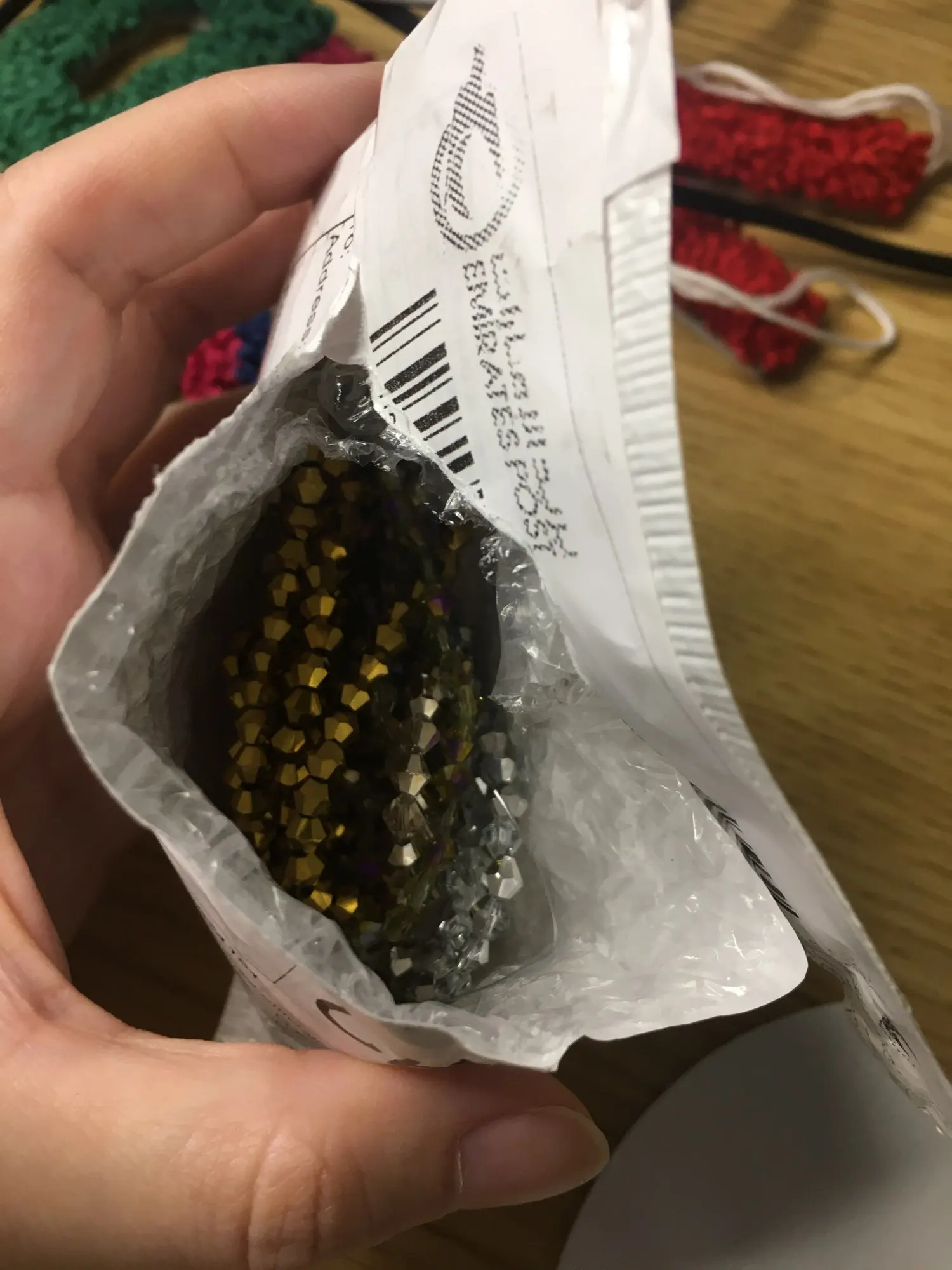 Что называется наконец то дождалась, думала вообще не придёт посылка. Бусины классные, рекомендую, если бы не очень долгая доставка