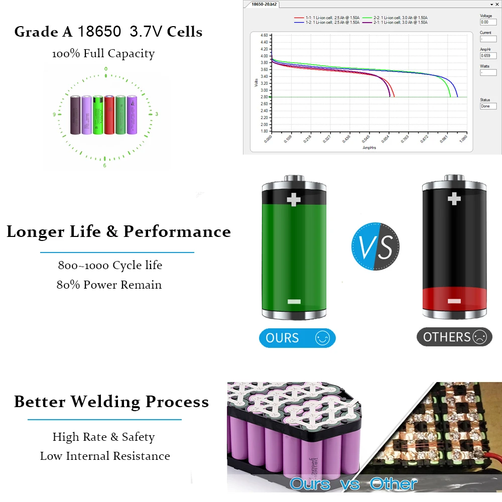 Все наши пакеты состоят из аутентичных аккумуляторов класса A 18650, изготовленных в Китае, Корее или Японии. Мы используем Sanyo Panasonic Samsung , LG или китайский бренд класса А и используем только самые лучшие модели этих брендов. И все наши батареи никогда не будут