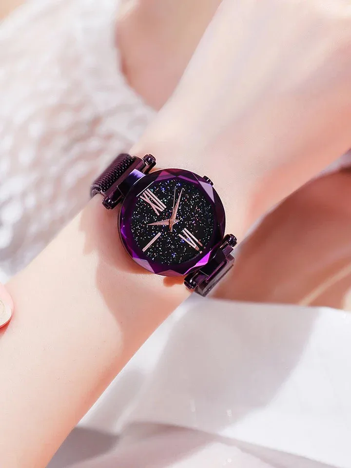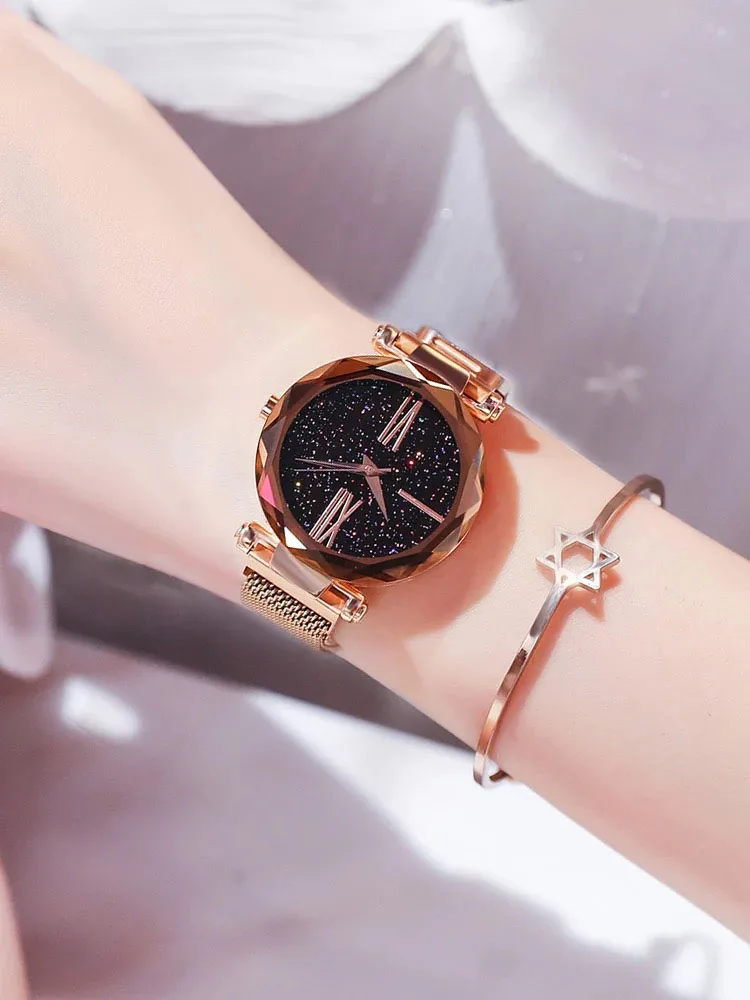 Часы женские кварцевые, с магнитом, звездное небо, розовое золото, сетка, повседневные, 2020