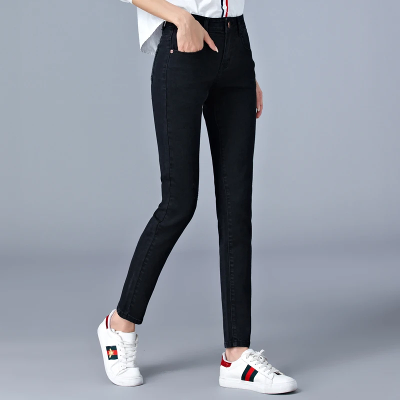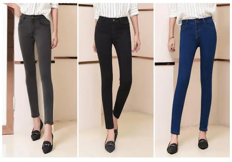 Джинсы для женщин с высокой талией плюс размер полной длины тощий карандаш черные синие джинсовые брюки 100 кг