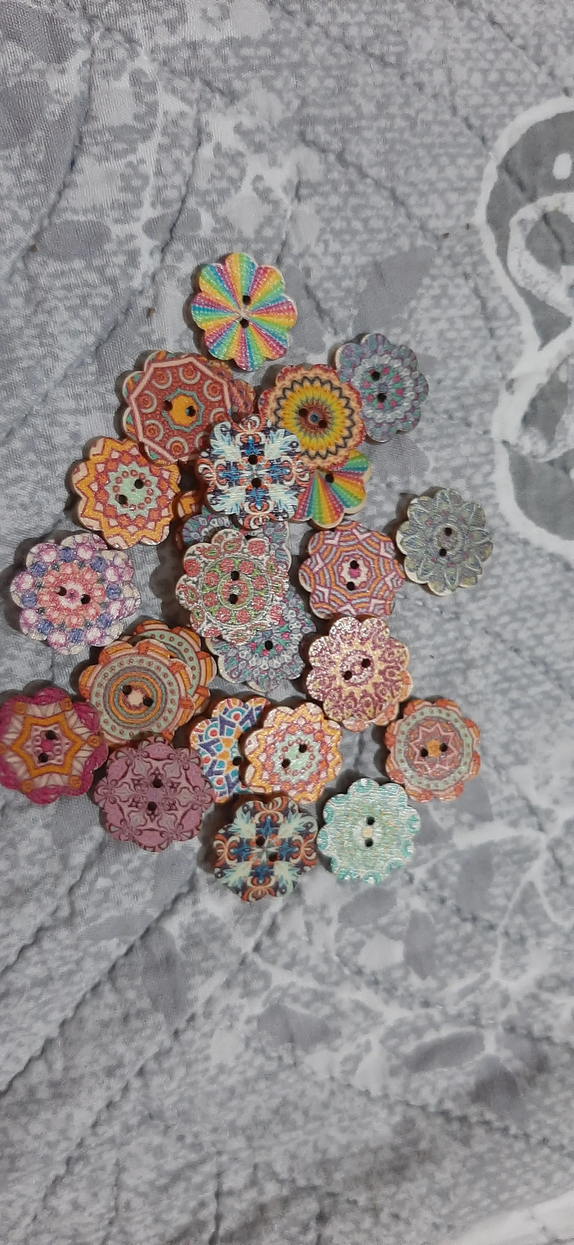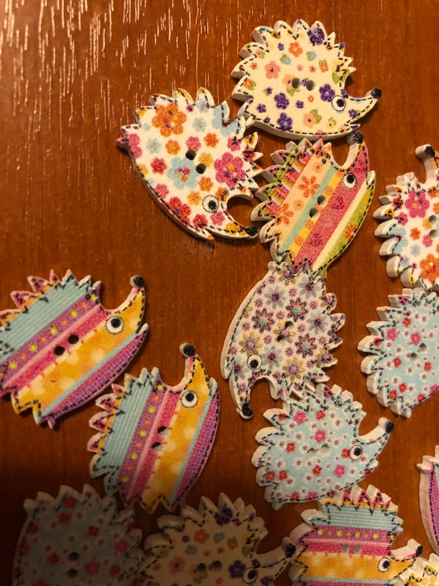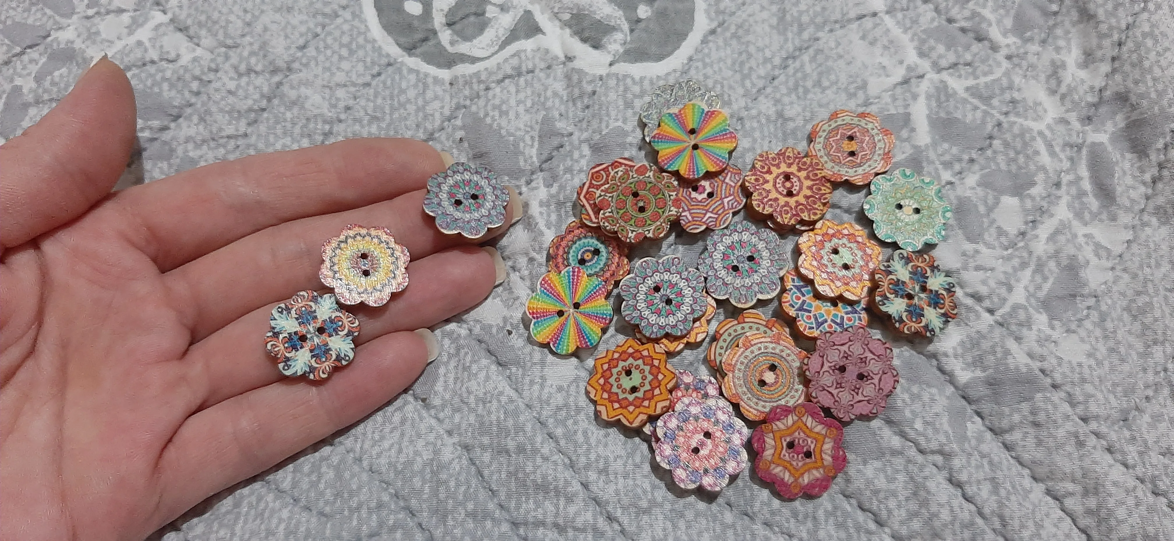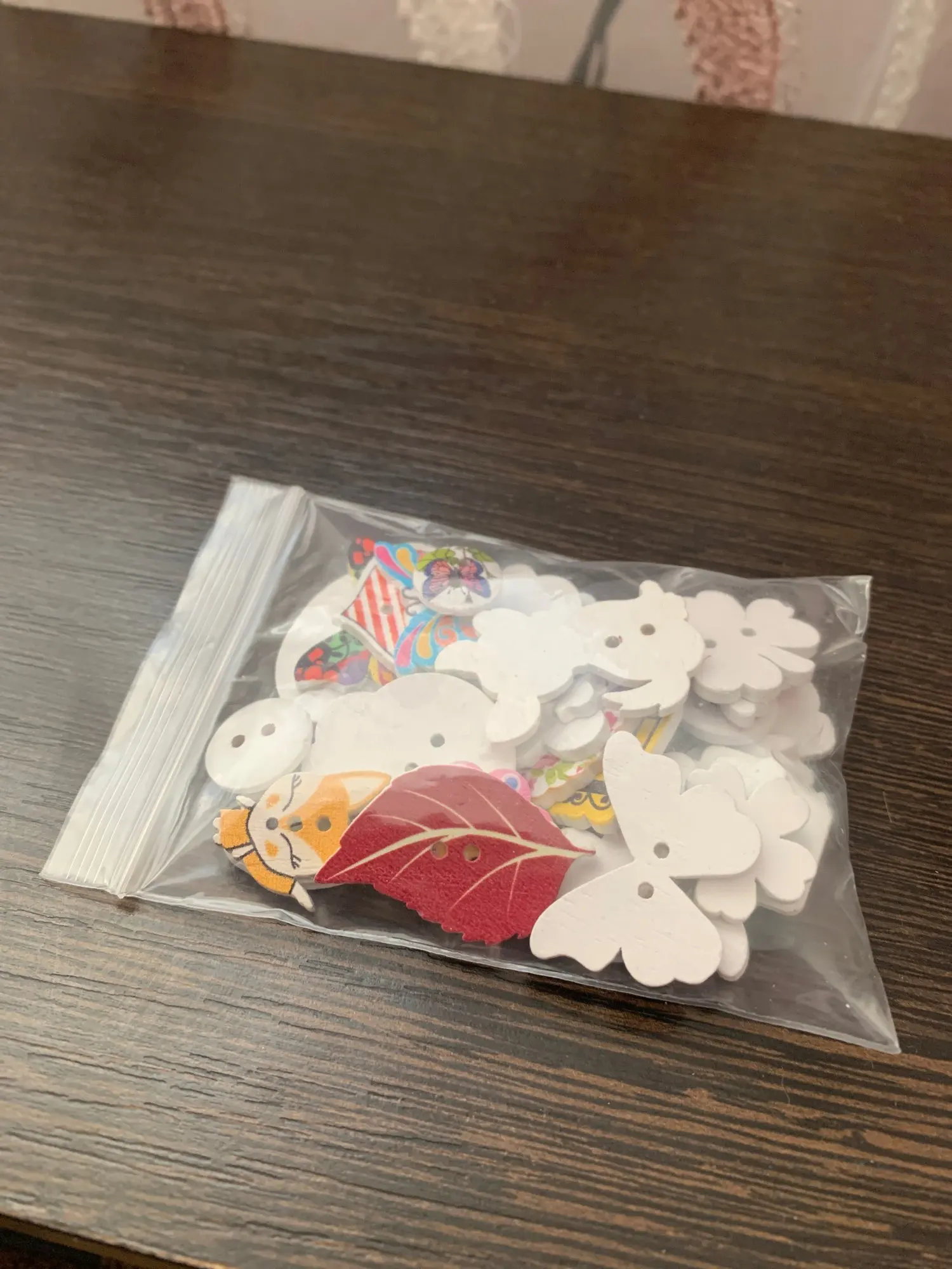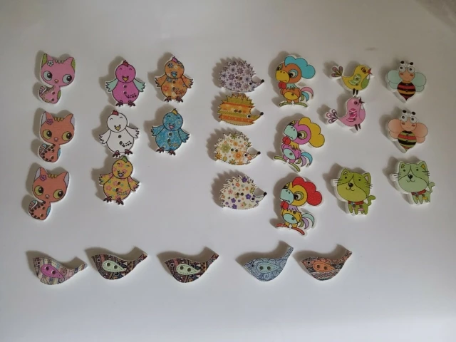 Очень красивые пуговки. Только имейте ввиду, что на некоторых фигурках дырочки расположены так, что пуговки оттопыриваются после пришивания. В остальном всё как на картинке.