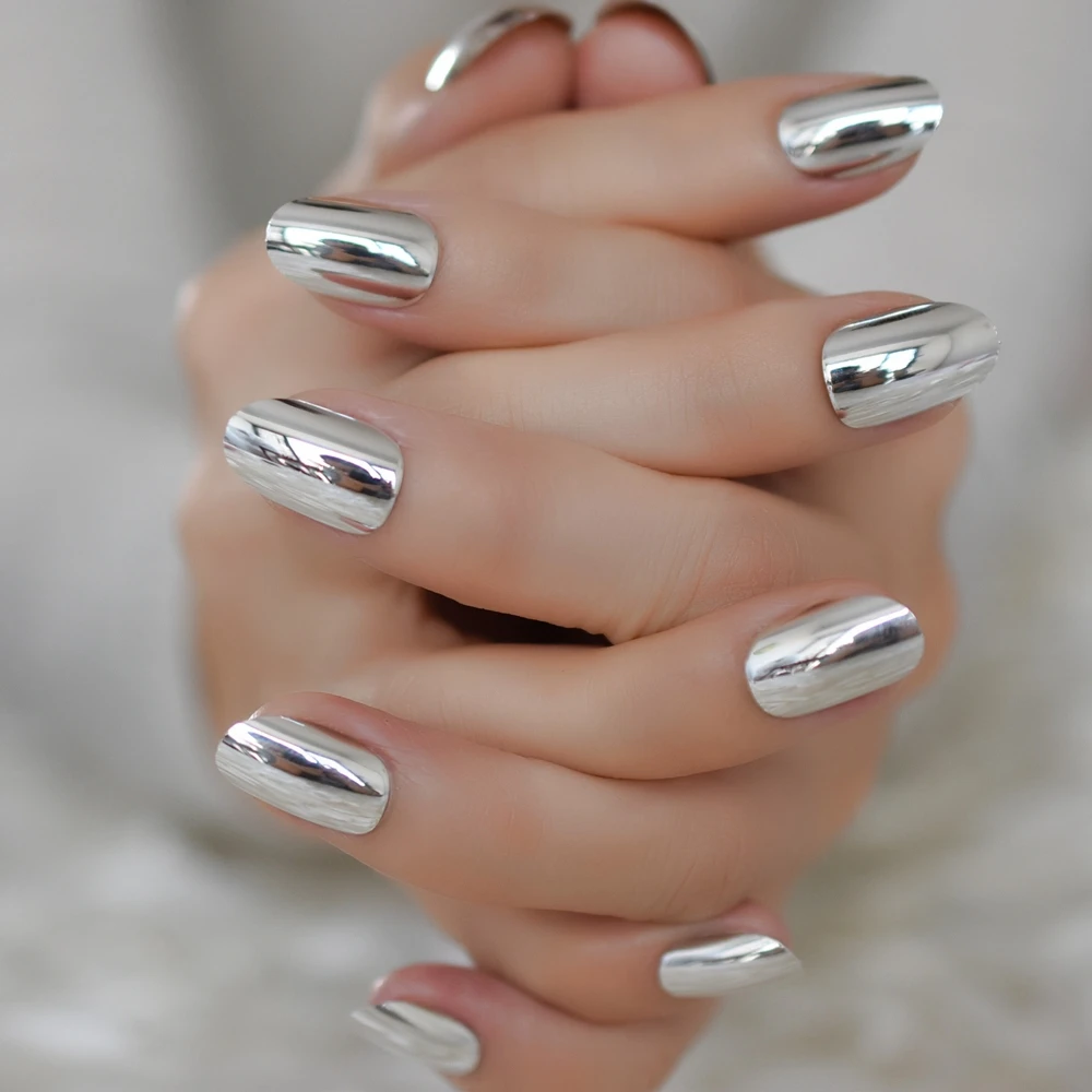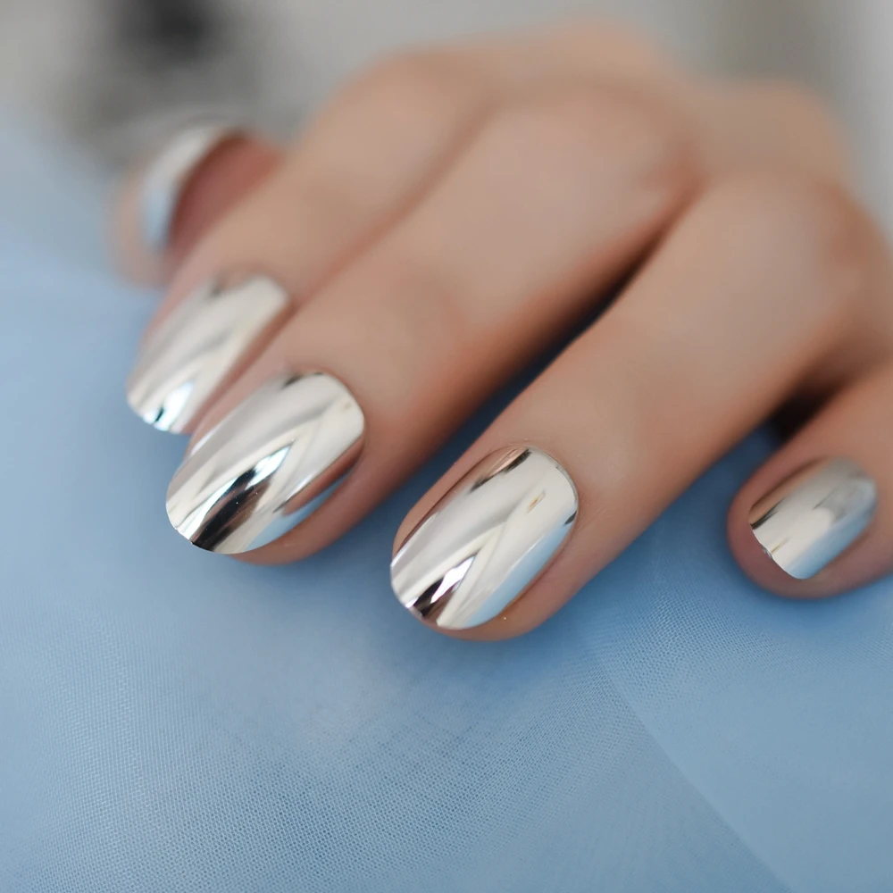 Качественные овальные поддельные ногти, серебряное зеркало, искусственный Ongle, Короткие повседневные ногти, металлический стиль, гламурный наконечник для ногтей
