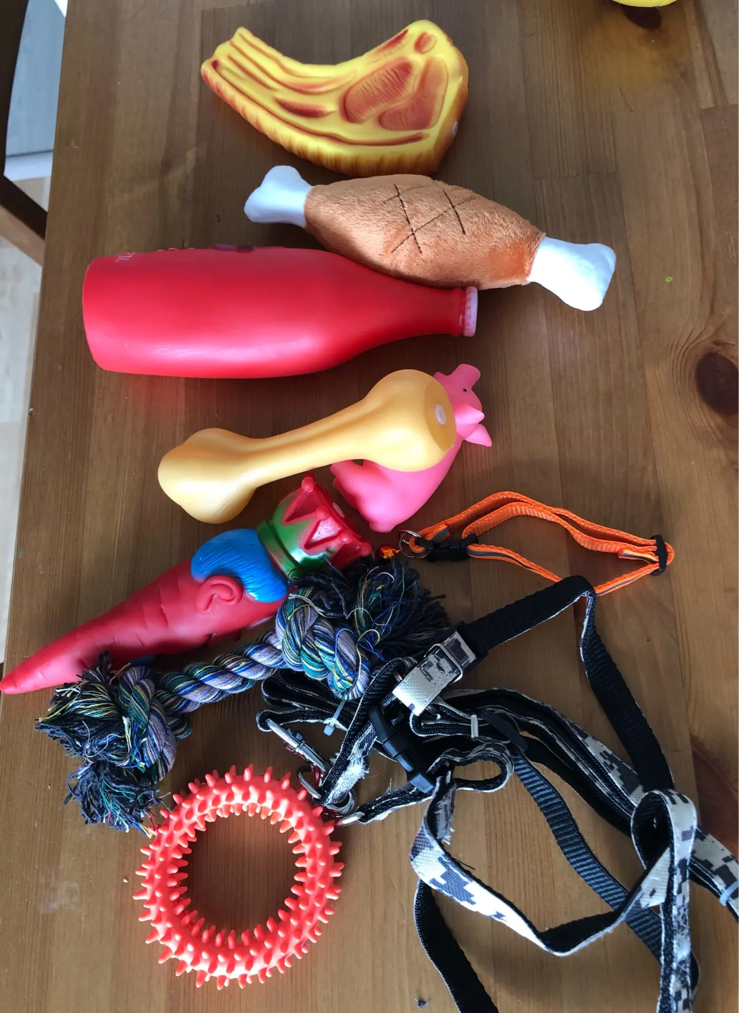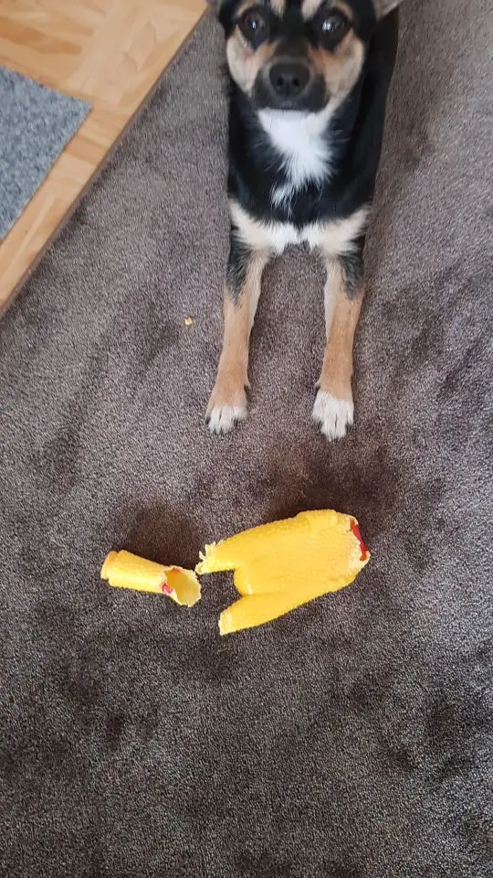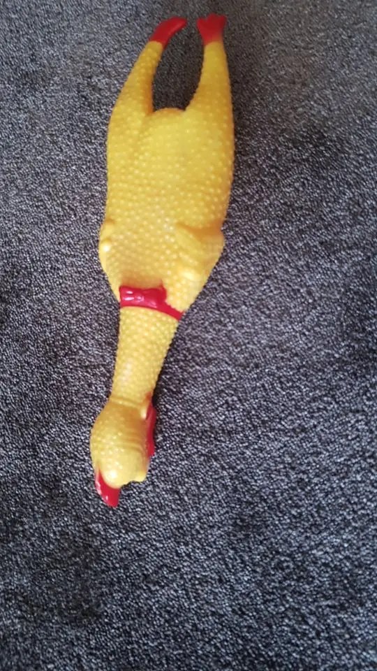 Пятна красной краски по телу, голова с пищалкой просто вставляется в тело. Собака периодически разбирает её. Так себе игрушка. Шло долго.