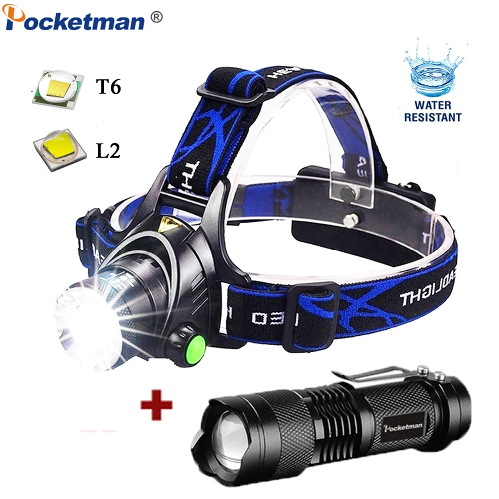 Налобный фонарь T6L2 с зумом, перезаряжаемый, водонепроницаемый, налобный фонарь, налобный фонарь с аккумулятором 2*18650