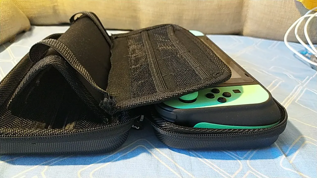 Чехол недостаточно твёрдый, в кейсе от Skull&Co не влезает - мешалась центральная секция с подставкой. Решилось радикально - вырезанием внутренней структуры (подставки и секции с кармашками под картриджи), ещё наверное вырежу молнию и заменю на резинки - чтобы не задевала экран (чехол-то не особо жёсткий, и изначально прилично прогинался, до "операции"). Для обычного перемещения по городу подходит, а для длинных поездок смотрите в сторону кейса и сумки от Skull&Co (но та сумка прилично тяжелее, но жёстче и больше по объёму). Без защитного кейсам может и проще было бы, но без кейса проще и удобнее пользоваться оригинальной сумкой от Нинтендо - тут центральная секция прям упиралась в стики, а в оригинальной сумке центральная секция оказывается между ними и по высоте примерно с них высотой.
