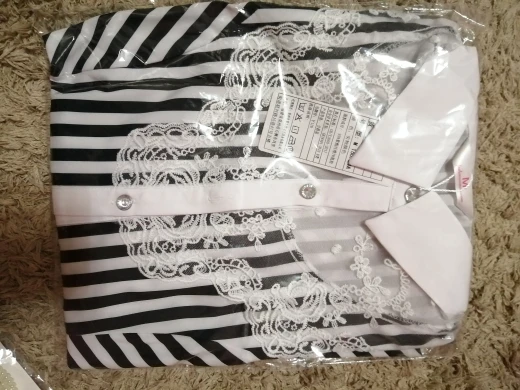 Брали на груд 100 см, сошлось только-только. В целом выглядит неплохо. Но качество пошива, как и многая одежды с АЛИ, криво косо прошито. На горловине съехавшая мимо строчка. У низка тоже в одном месте съехало мимо, на обеих полочка низка кривая строчка, начинающаяся не с самого начала, и нитки запутавшиеся клубками. В общем тут кривенько, сдесь косенько. Поэтому верещать от удовольствия не от чего. Я человек, который шьёт своими руками, мамуля швея, нас такие строчки заставляла перешивать и все переделывать, в советское время ОТК бы такое изделии не дозволили допустить до продажи. Да, ещё супер минус, это строчка на рукаве, сборка для пышности, она должна быть спрятана в пройме, в шве, а но вся снаружи.