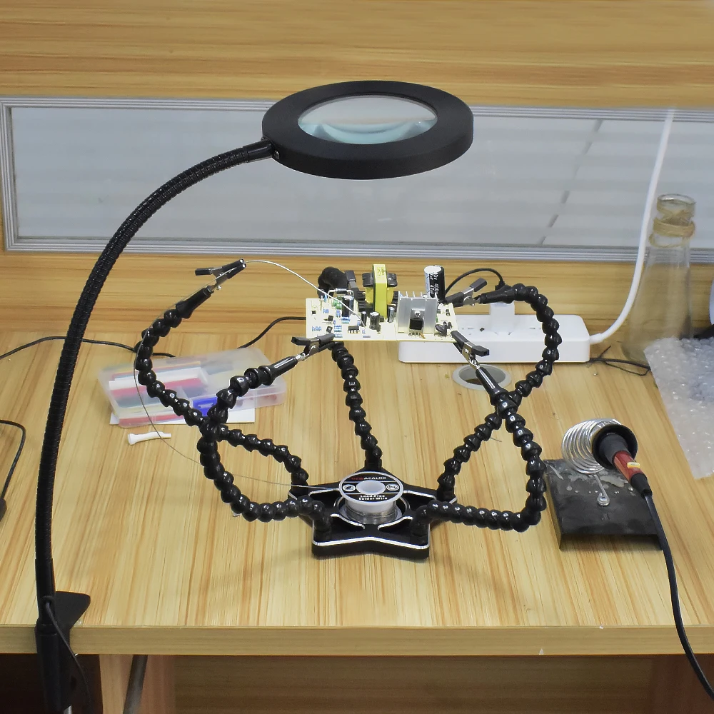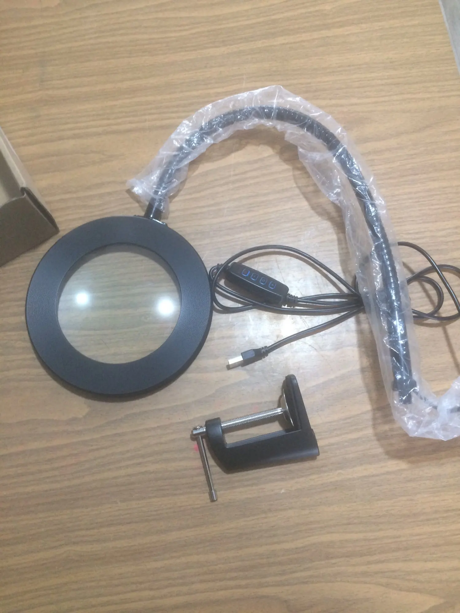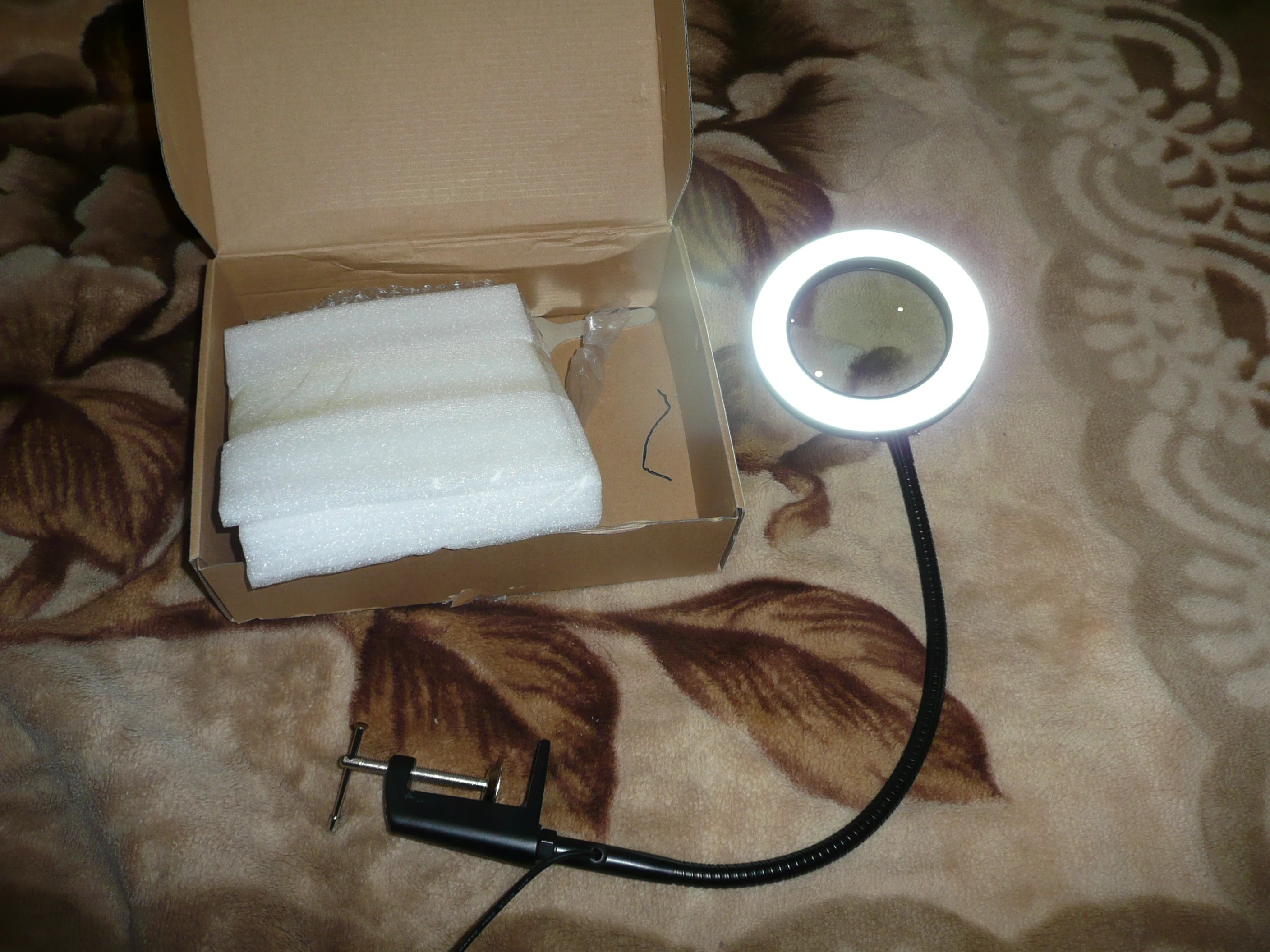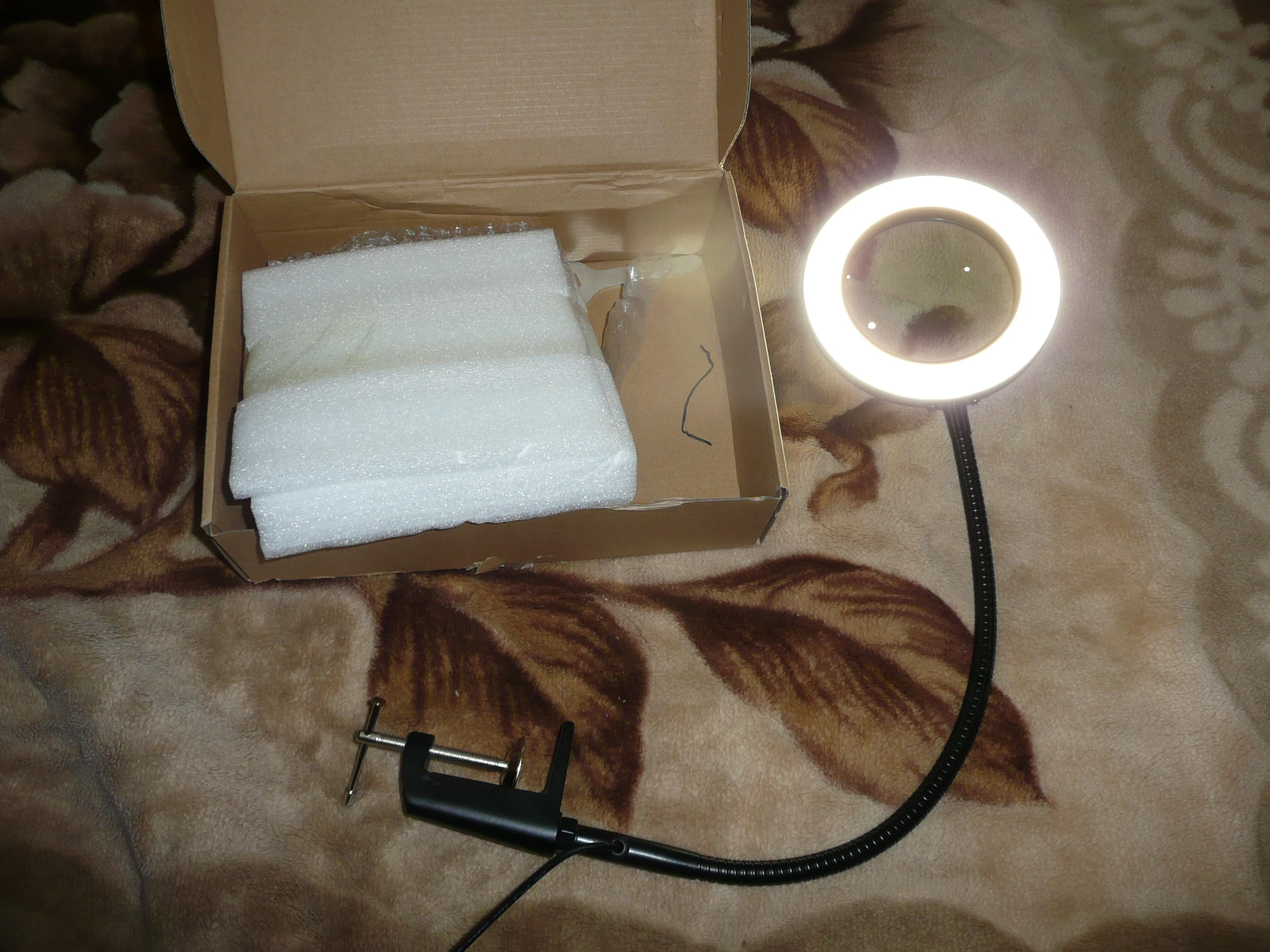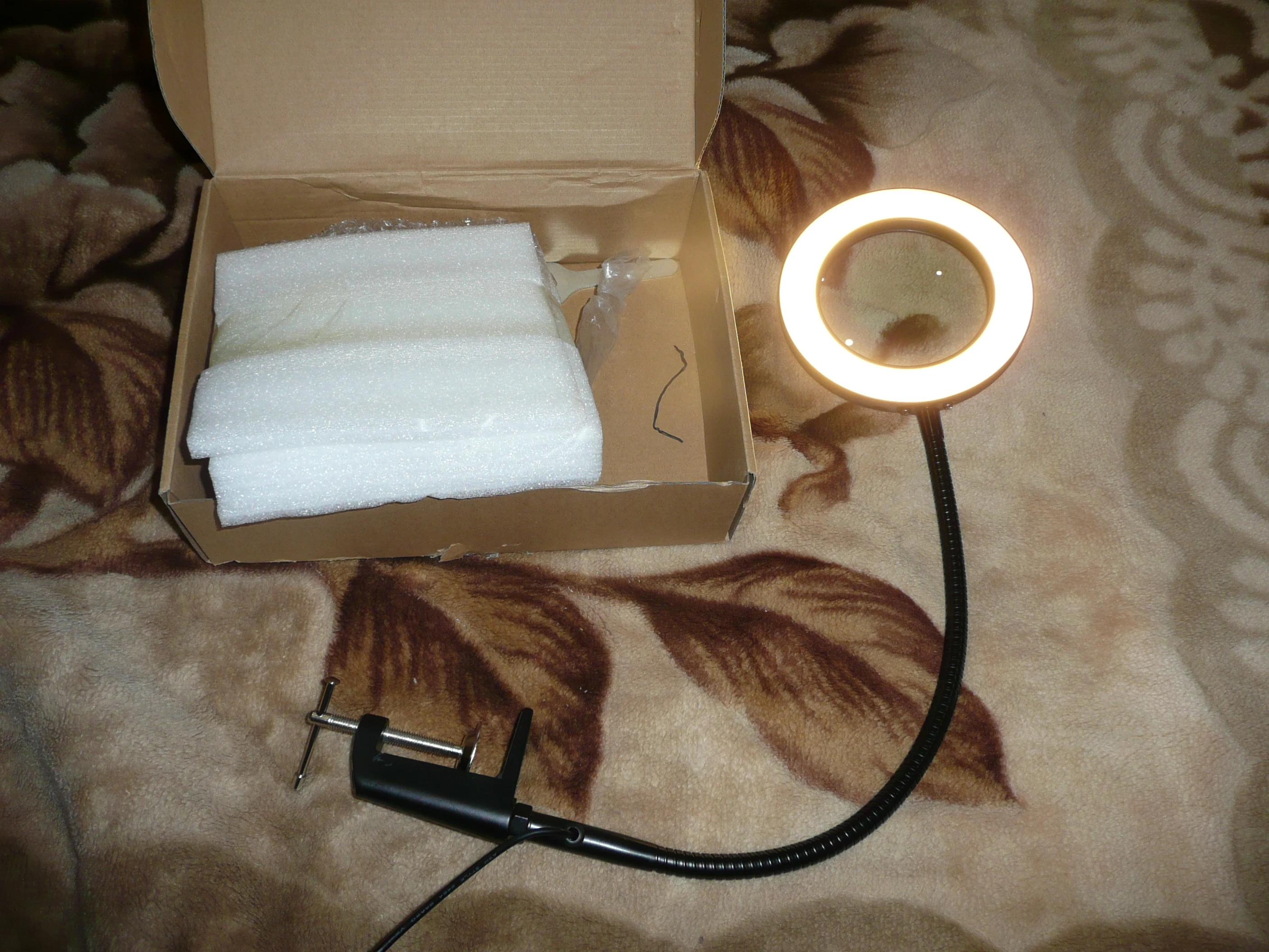 Товар получил через неделю после заказа (заказывал со склада в РФ). Курьер доставил посылку. Хорошая лампа-лупа. Девять уровней яркости. Три цвета (тона) излучения. Тёплый (включается один ряд светодиодов), холодный (включается другой ряд светодиодов). И нейтральный (включаются оба ряда светодиодов). Для питания необходимо отдельно приобрести блок питания на 5 вольт с USB-интерфейсом. Я пока подключаю через ЗУ мощностью 4 А. Но и он хорошо нагревается во время работы лампы на максимальном режиме. Буду искать что-то более мощное для питания этой лампы-лупы. Из придирок - струбцина хоть и силуминовая, но боюсь сильно затягивать её на столе. Опасаюсь поломки. Струбцине можно было бы для большей прочности добавить ребра жёсткости. Гибкая штанга держит лампу-лупу хорошо. Не болтается и не падает вниз. Спасибо китайским производителям. Продавца рекомендую.