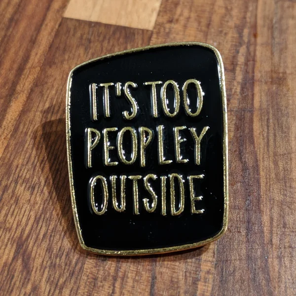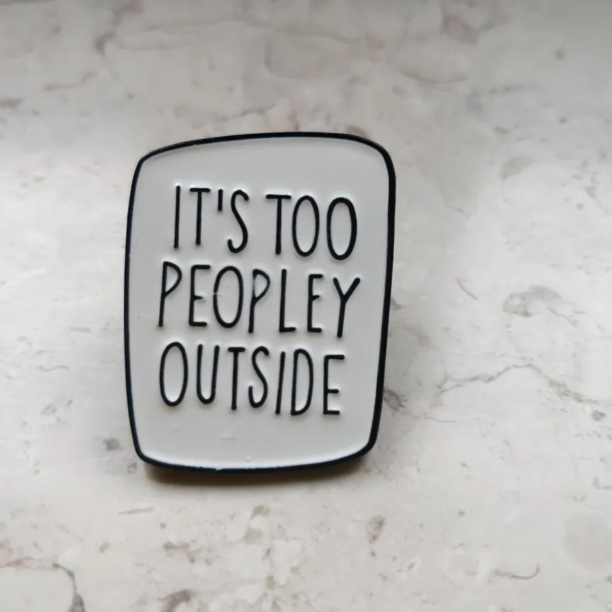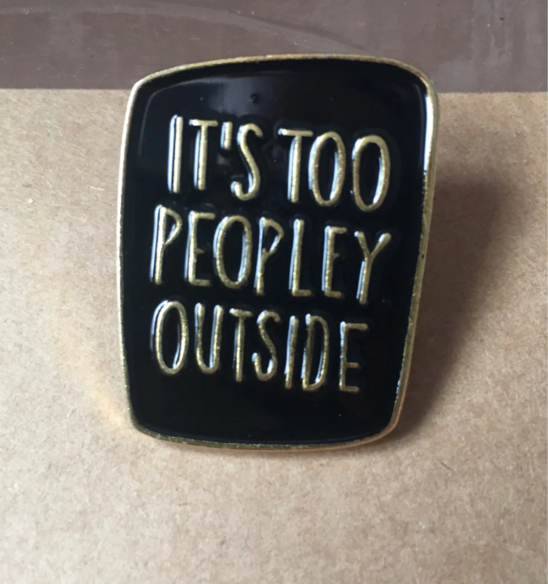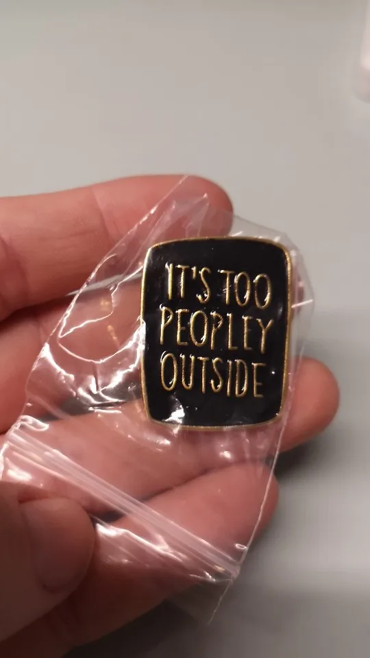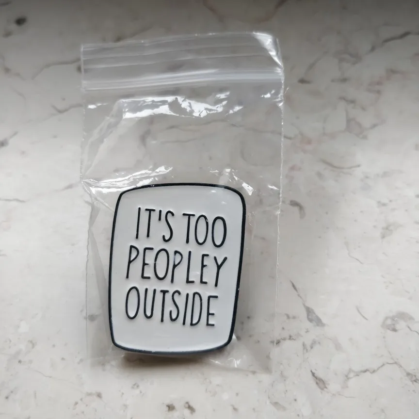«Снаружи слишком много людей» во время карантина по коронавирусу весьма актуально, поэтому и купила значок. До Москвы полтора месяца, кинули в почтовый ящик. Значок довольно тяжелый, на легкую ткань лучше не прикалывать.
