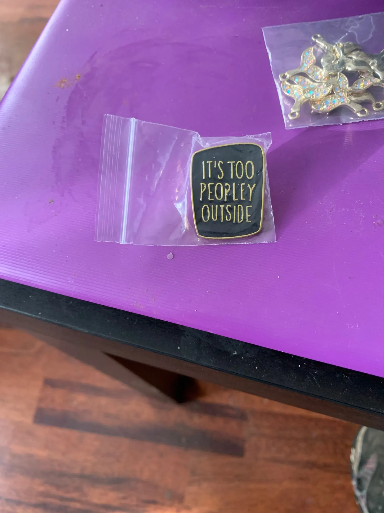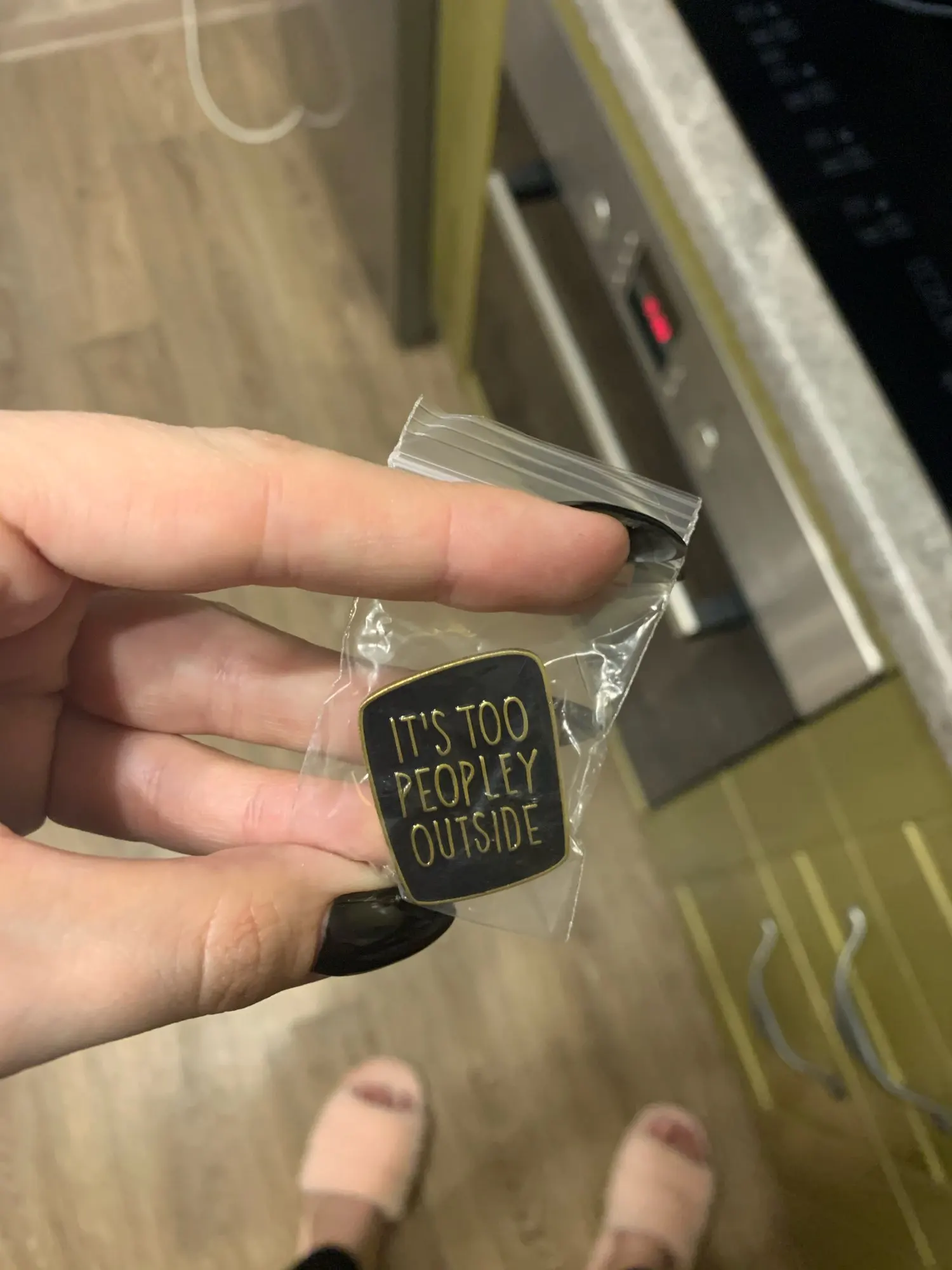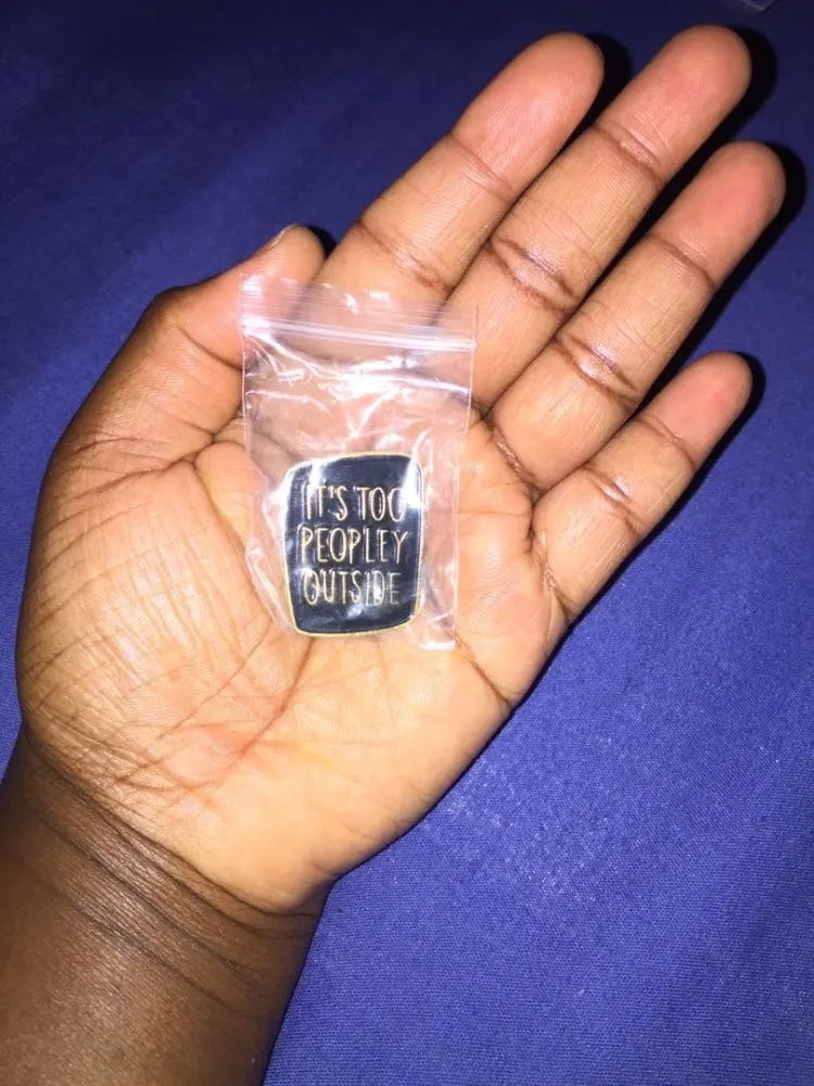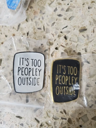 «Снаружи слишком много людей» во время карантина по коронавирусу весьма актуально, поэтому и купила значок. До Москвы полтора месяца, кинули в почтовый ящик. Значок довольно тяжелый, на легкую ткань лучше не прикалывать.