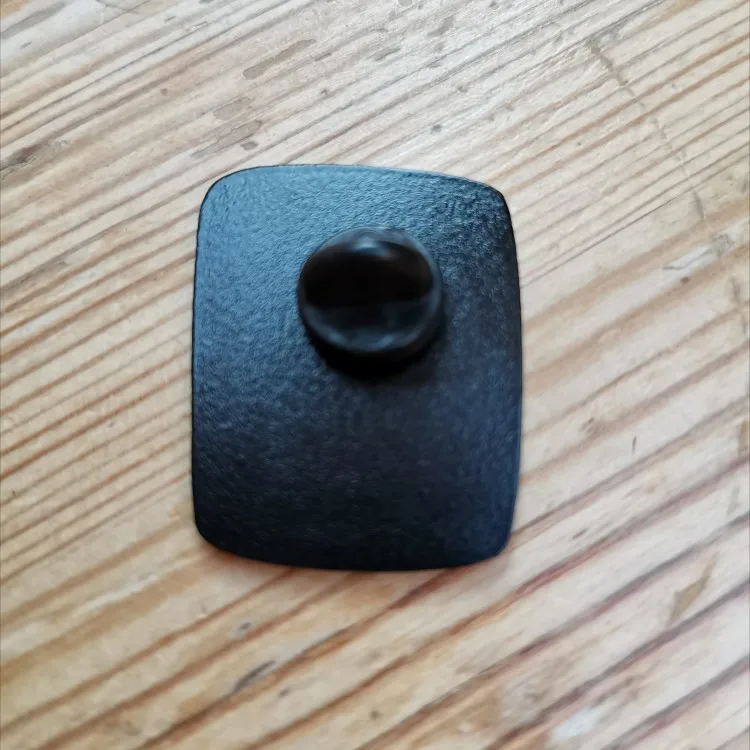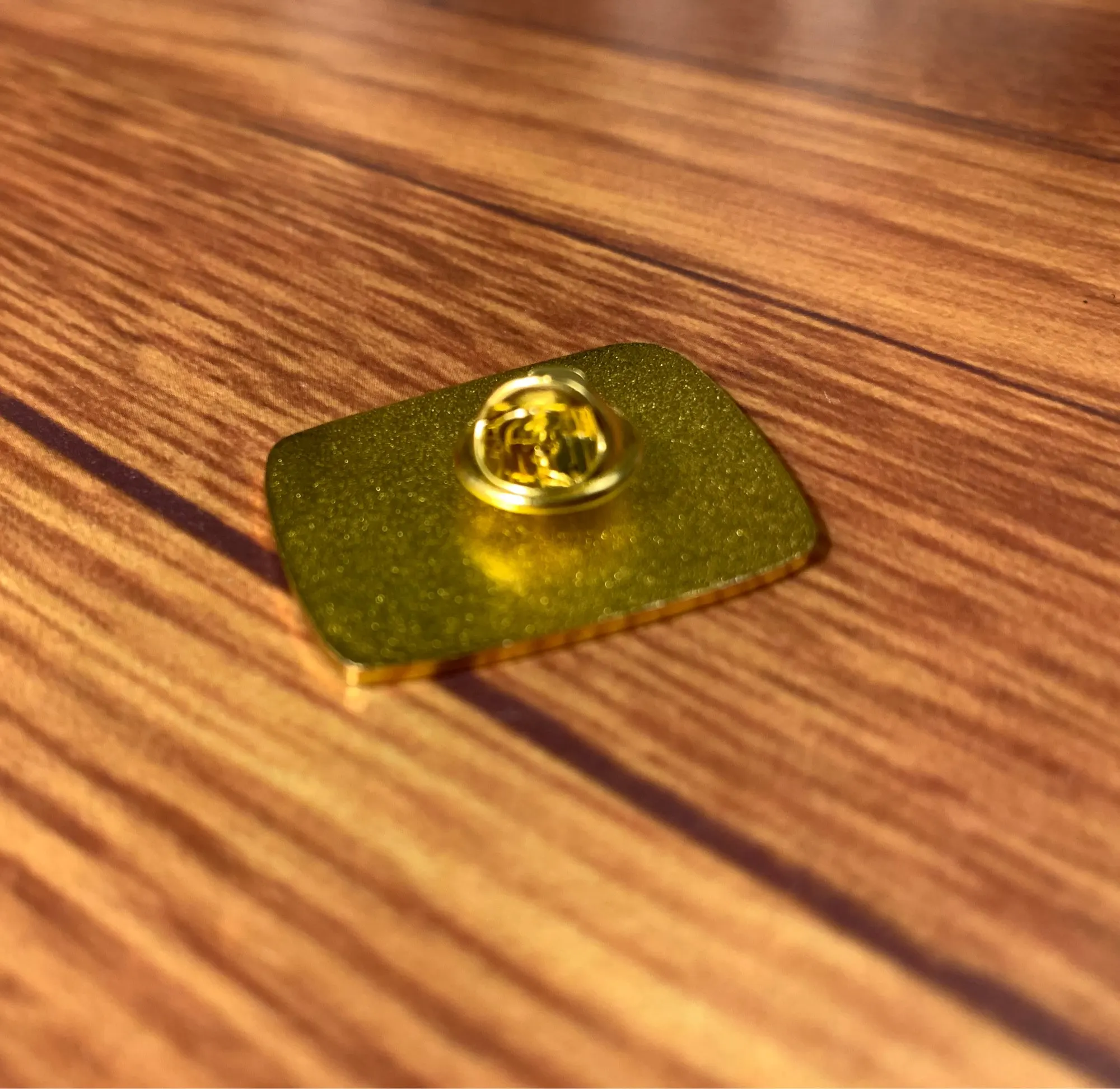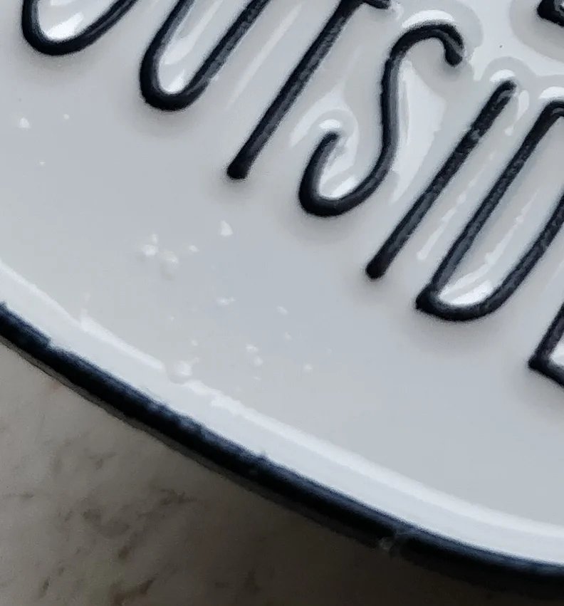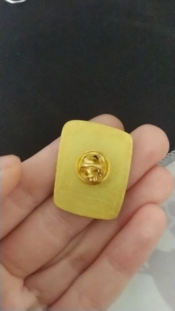 Значок выглядит как значок на изображении, но некоторые части черной надписи покрыты белой эмалью.
