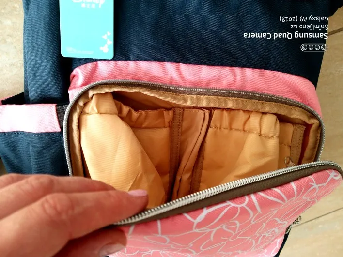Это очень красиво, как указано в описании. Висячие полоски на тележке темно-синего цвета, того же цвета, что и рюкзак (хотя на фото черный, темно-синий). Мне очень понравились молнии с головой Микки. Во внешнем кармане появились грелка для бутылок и ленты для подвешивания. Хорошо упаковано, хорошо пахнет. Он пришел в оригинальной сумке Диснея. Нет проблем с доставкой, прибыл Сертифицированный и быстрый (только до месяца)