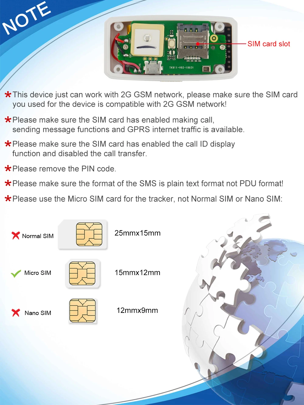 1.Наш GPS-трекер может работать только с сетью 2G GSM, он не поддерживает сети 3G 4G или 5G. Если ваша SIM-карта 3G 4G также поддерживает сеть 2G, ее можно использовать. Но если в вашей стране сеть 2G закрыта, мы предлагаем вам выбрать наш 3G 4G GPS GSM трекер.