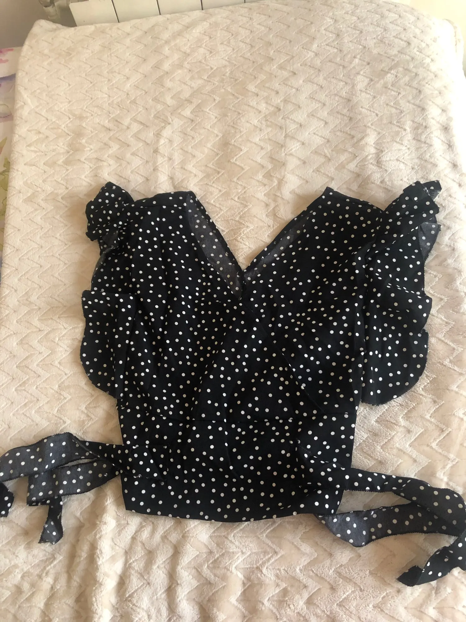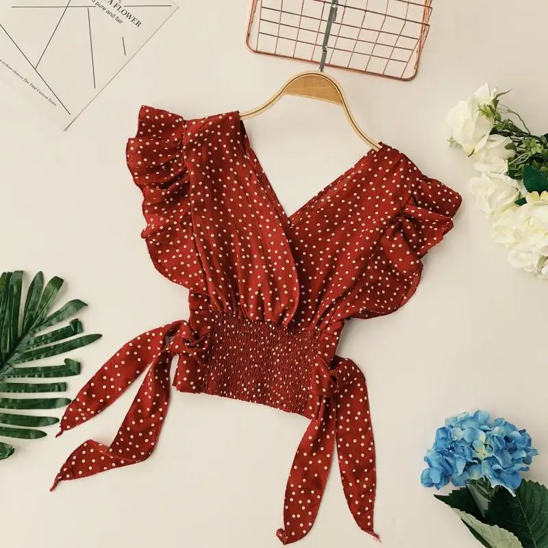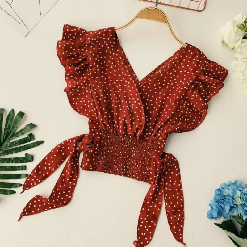 Шифоновая Блузка в горошек, с V-образным вырезом и коротким рукавом-лепестком, с эластичной завышенной талией и бантом, соблазнительные топы с оборками