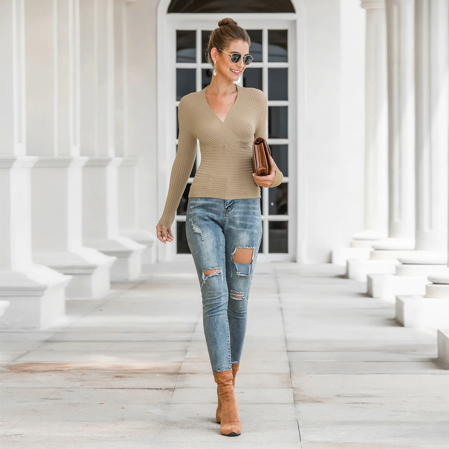 Женский трикотажный свитер с длинным рукавом и V-образным вырезом