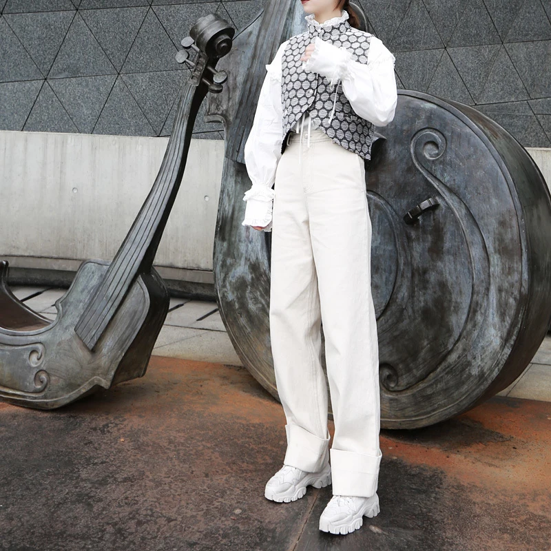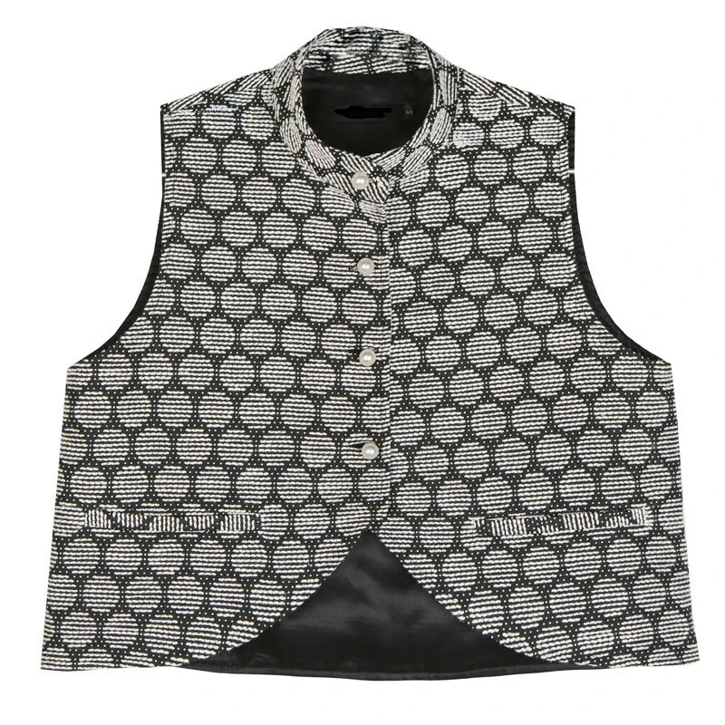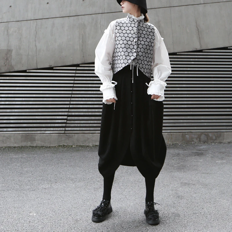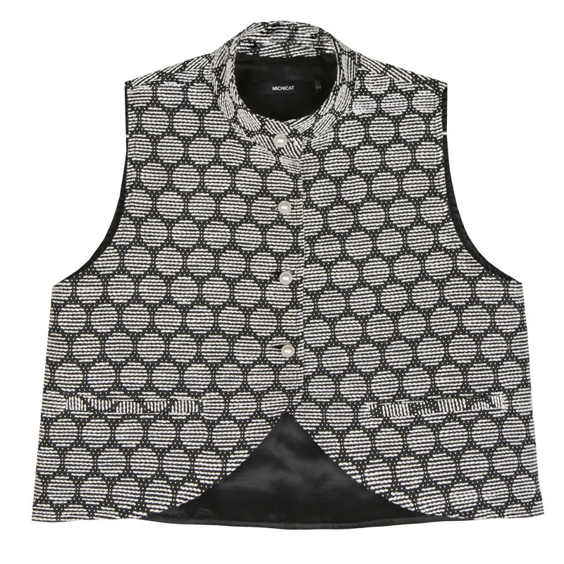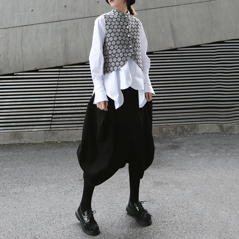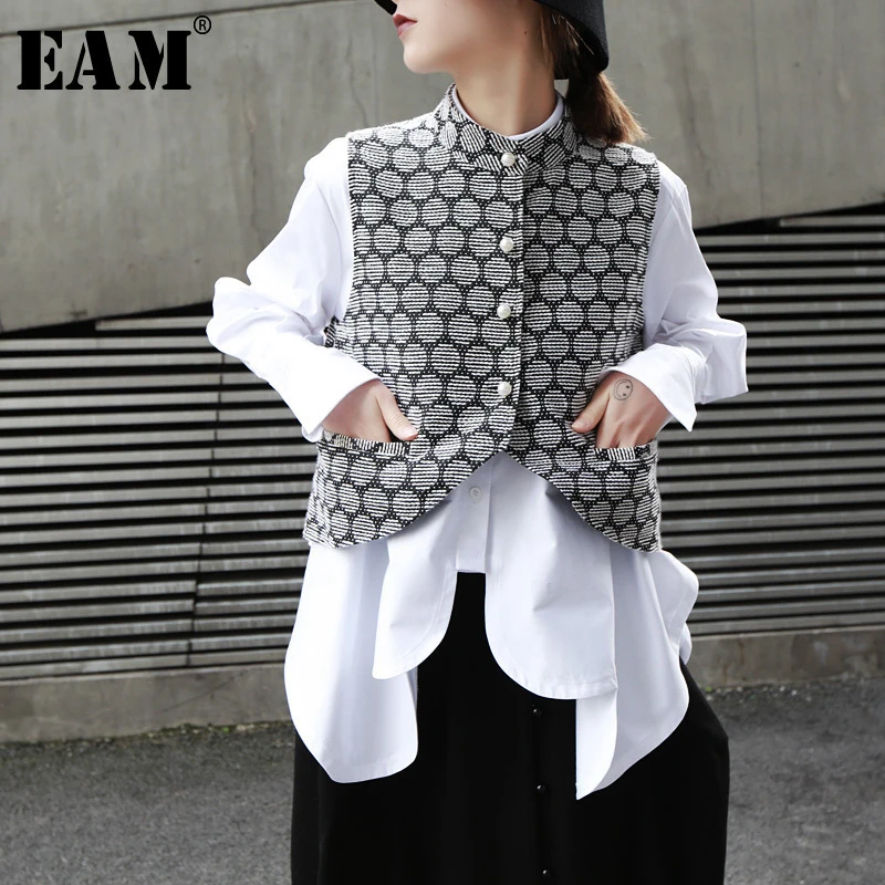 EAM 2022 Новинка весна лето воротник стойка без рукавов жаккардовый Асимметричный перламутровый Карманный подол Свободный жилет женская мода JO196