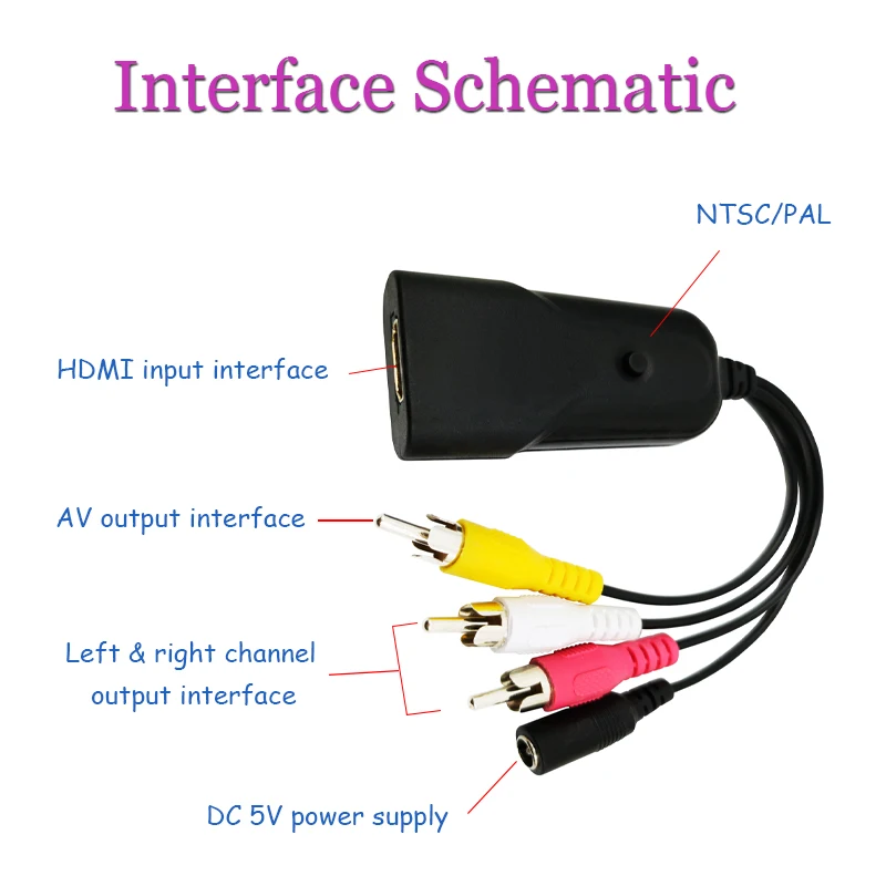 Мини hdmi A-V адаптер сигнала, который изменит HDMI видео сигнал или аудио сигнал на AV (CVBS) композитный видео сигнал и FL / FR стерео аудио сигналы, в то время как Поддержка DVI системы sideline сигналы. Чтобы помочь пользователям изменить Высокое качество видеосигнала HDMI на обычный CVBS сигнал (стандартное разрешение 480i, 576i,). Так что можно воспроизводить на ТВ, VHS видеомагнитофон, DVD рекордеры и т. Д. Также поддерживает NTSC и PAL два ТВ-формата.