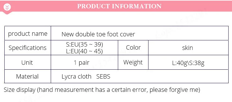 Информация о продукте 【Название продукта: 】новый чехол для ног с двумя носками 【Характеристики: 】 S:EU(35 ~ 40) L:EU(40 ~ 45) 【Единица: 】 1 пара 【Материал: 】 лайкра ткань SEBS 【Цвет: 】 кожа 【Вес: 】 l: 40 г S:38 г S:EU(35-39) L:EU(40-45) Размер дисплея (ручное измерение имеет определенную разницу, пожалуйста, простите меня)