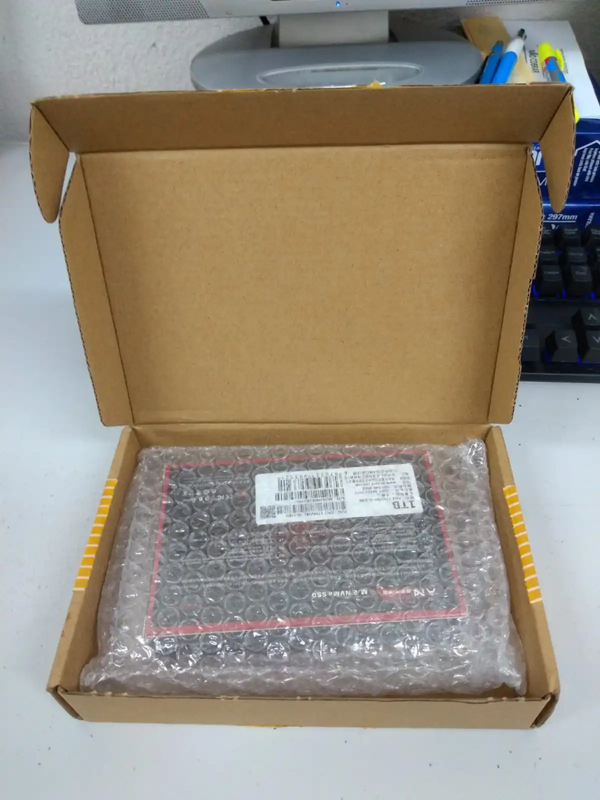 Очень хорошо упакованная коробка. Очень быстрая доставка SSD с 14 календарными днями. Рекомендуем также магазин и продавцу и не облагать налогом.