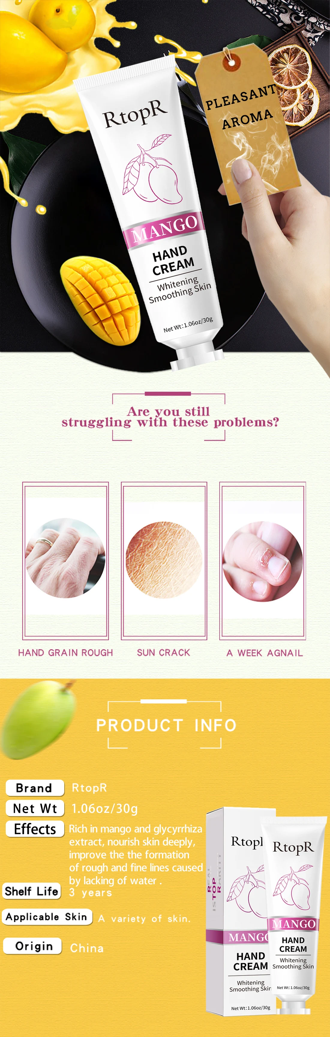 Богатый экстрактом манго и глициррхизы, питает кожу глубоко, улучшает образование грубых и тонких линий, вызванных недостатком воды. Он также содержит гиалуроновую кислоту, может укрепить и питать нежные руки и поддерживать кожу увлажненной в течение длительного времени, сделать ваши руки пухлыми и пружинными, мягкими и яркими, дает свежесть, удобный и приятный аромат.