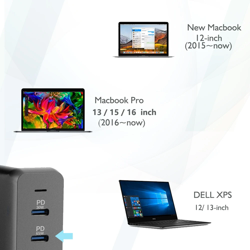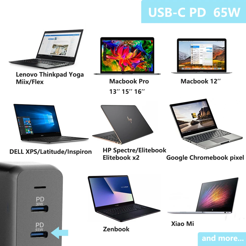 Совместимость с кабелем Type C и Type C обеспечивает зарядку большинства ноутбуков USB-C, таких как MacBook 12 дюймов/Macbook Pro 13 дюймов 15 дюймов, DELL XPS 12 дюймов 13 дюймов Latitude , Google Chromebook Pixel, zenbook, Razer и другие Поскольку этот порт составляет 65 Вт, скорость зарядки будет медленнее, чем у оригинального зарядного устройства, если Номинальная мощность устройства превышает 65 Вт. Этот порт также может заряжать смартфоны Android с питанием от типа C
