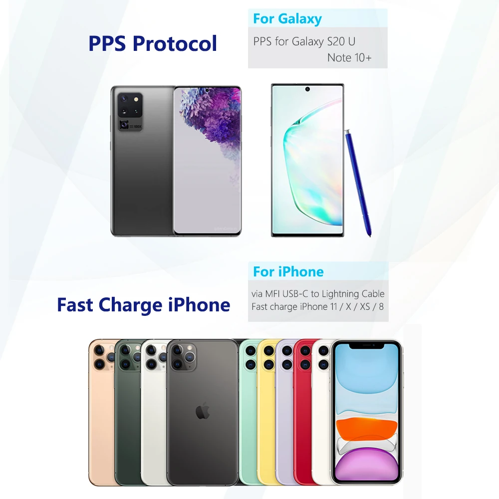 Для смартфонов на базе Android USB-C, таких как совместимые с Galaxy S9/S9 Plus, Note 10 + ,Pixel 2/2XL Nintendo Switch и других. Для планшета с питанием от USB-C дюйма, такого как совместимый iPad Pro 2018 2019 11 дюймов 12,9 дюйма или Macbook 12 дюймов Мощность этого порта составляет 30 Вт, не превышайте эту мощность. Соединение с кабелем MFI USB C/Lightning обеспечивает быструю зарядку iPhone 11/XR/XS/X/8 Plus