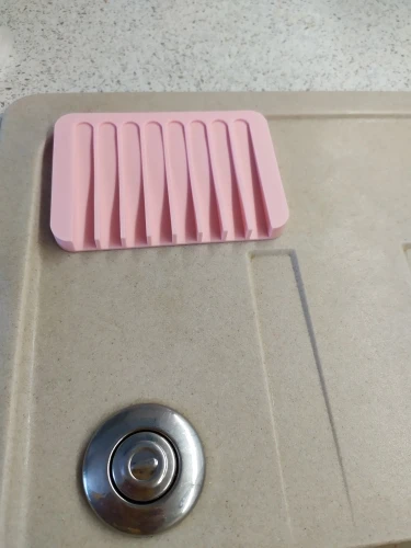 Удобная мыльница. На ножках нет резиночек, поэтому возможно на некоторых раковинах будет скользить. У меня из иск. камня, сильно не скользит.