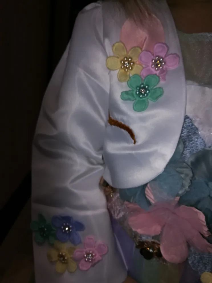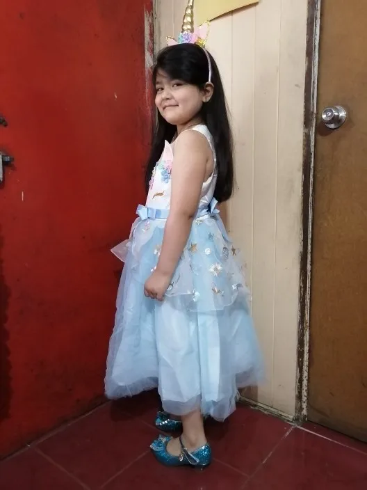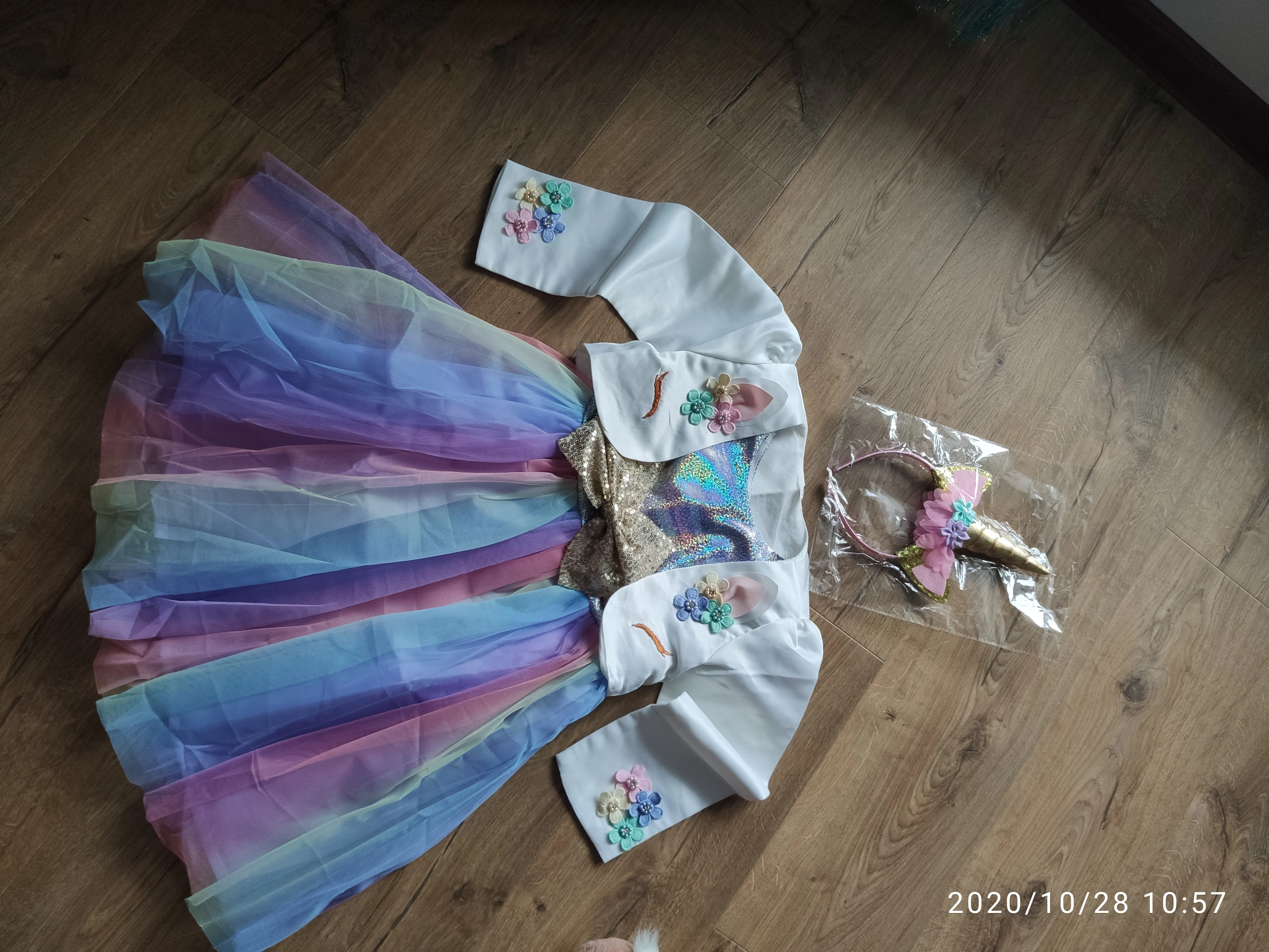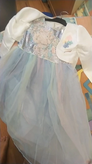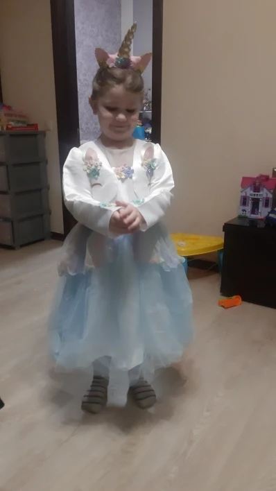 Платье выглядит красиво, очень красиво закончено. Я 4t, размер 110. Моей дочери 102. Я думаю, что это отлично подходит. Мне очень интересно ее реакцию. Я очень рад. Доставка длилась около месяца, с удовольствием вовремя заказал подарок на Рождество