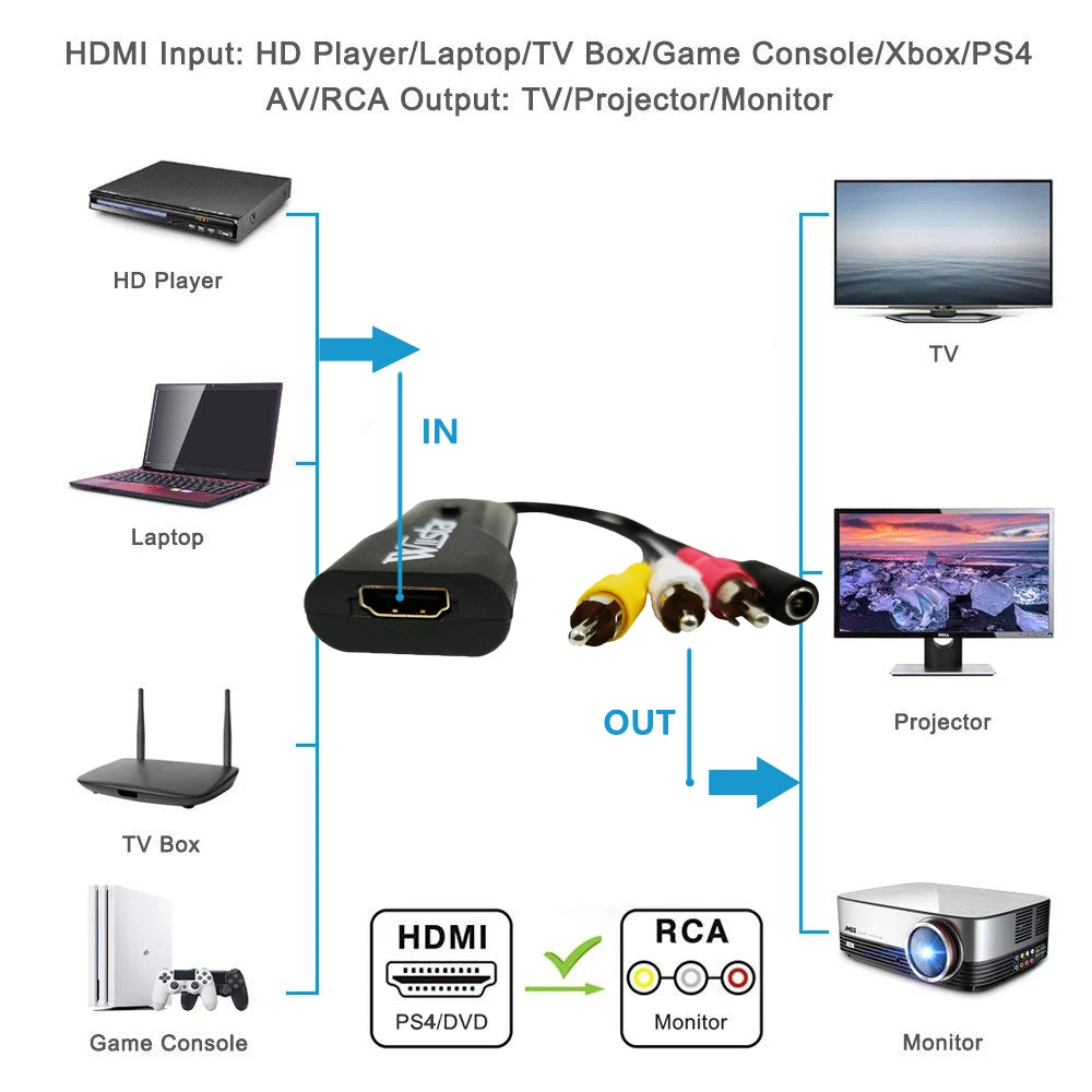 Преобразователь av-сигнала Wiistar HDMI-Male, который преобразует HDMI видео и аудио сигнал в AV CVBS Композитный сигнал и FL/FR стерео аудио сигналы, а также поддерживает сигналы DVI системы sideline. Чтобы помочь пользователям конвертировать высококачественный видеосигнал HDMI в обычный CVBS сигнал (стандартное разрешение 480i,576i). Так что можно воспроизводить на HD TV,VHS видеомагнитофон, DVD рекордеры и т. Д. И поддерживает NTSC и PAL два ТВ-формата.