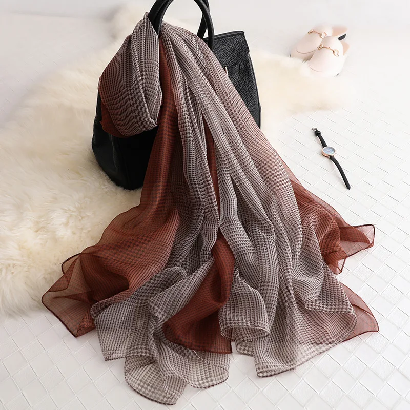 Новинка 2019, модный весенний шелковый шарф RUNMEIFA для женщинДамский клетчатый двухсторонний Длинный мягкий шарф и шали, Женский Пляжный платок
