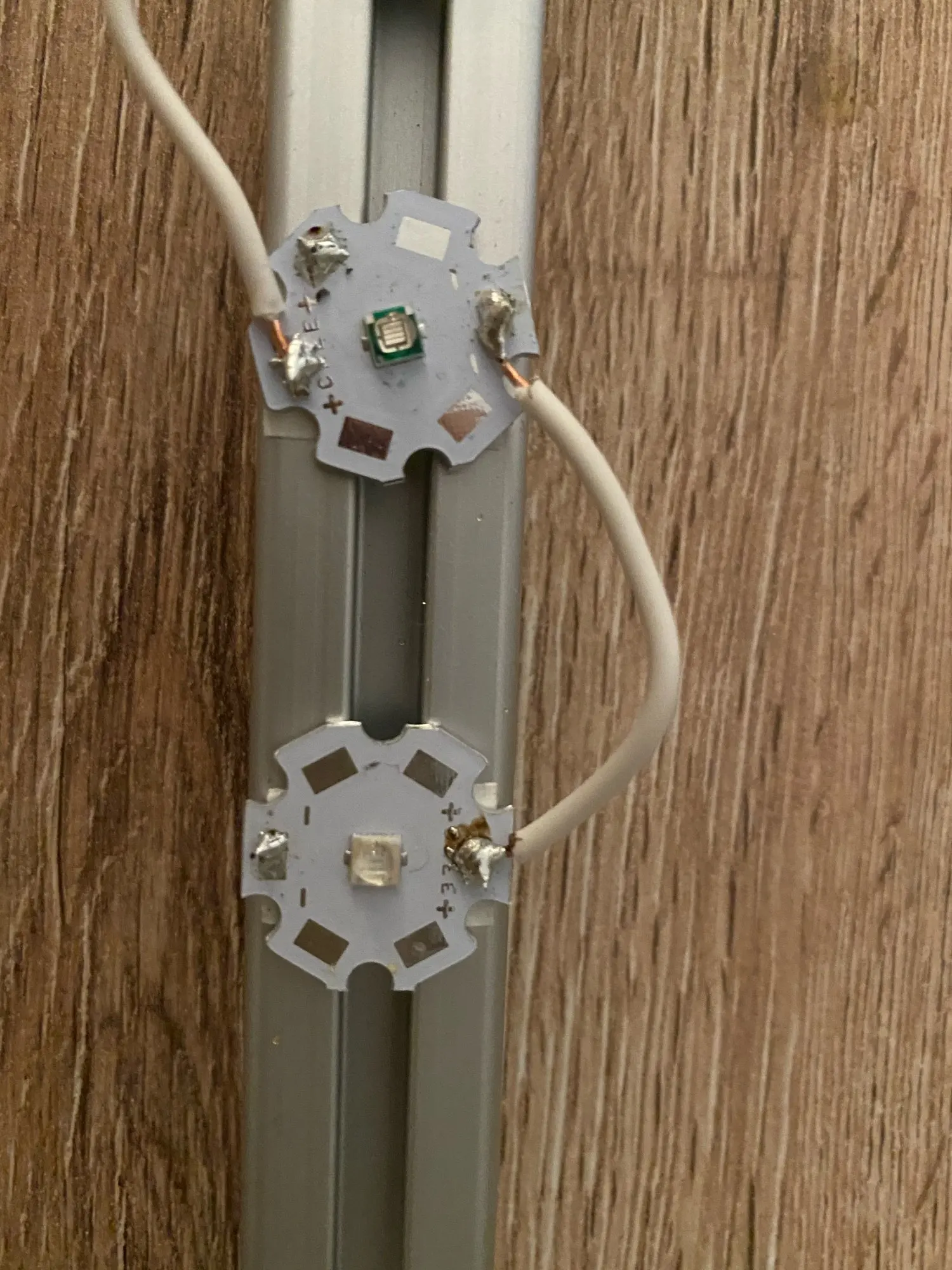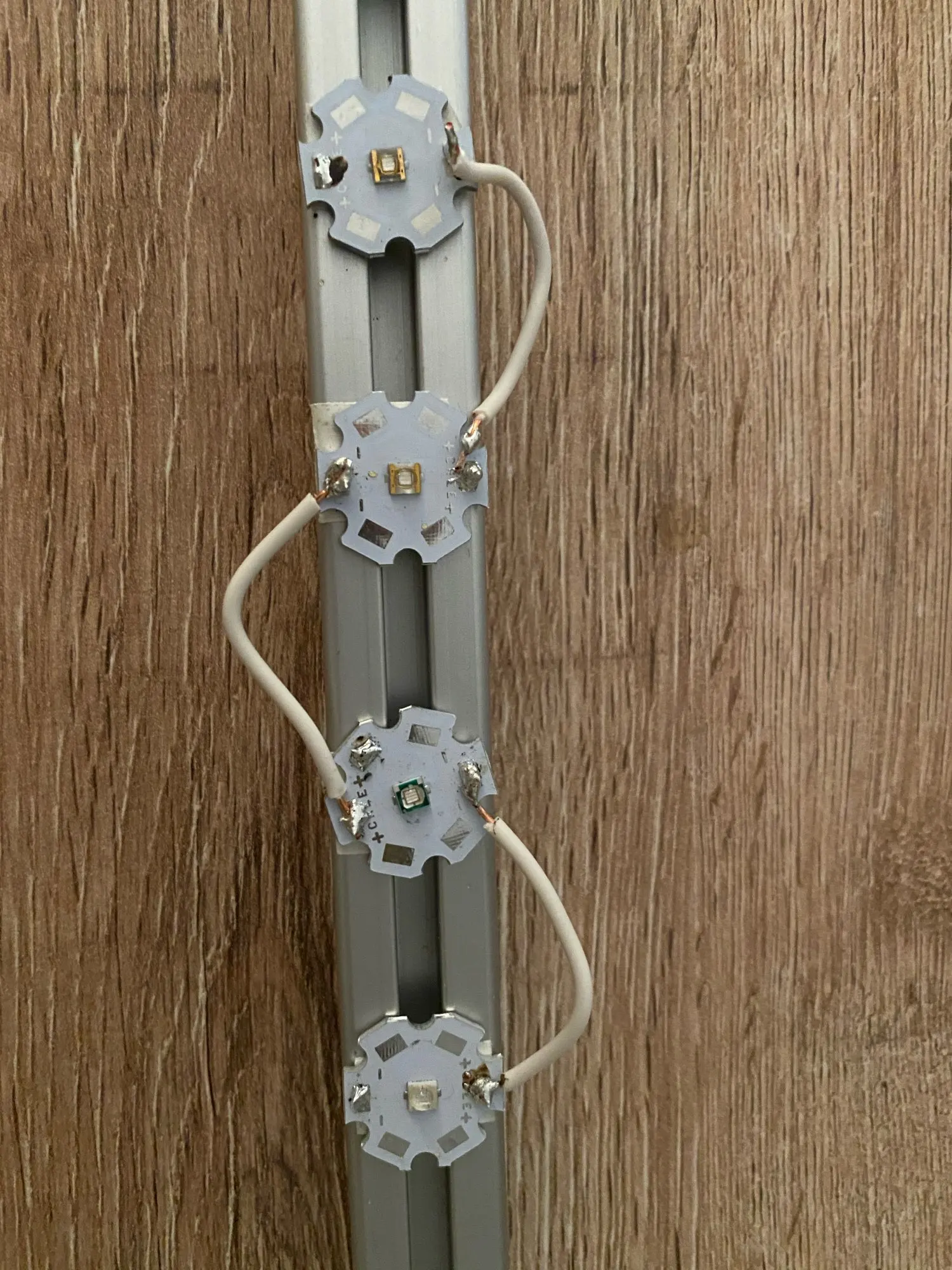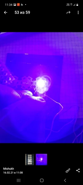Отличные диоды по такой цене. По нанометрам не скажу сколько, но ультрафиолет присутствует . Напряжение на токе 350мА в среднем 3,15В, разброс партии небольшой менее 0,1В. Чувствуется что кпд хороший на 350мА нагрев небольшой, можно спокойно наваливать и 700мА небоясь за диоды.