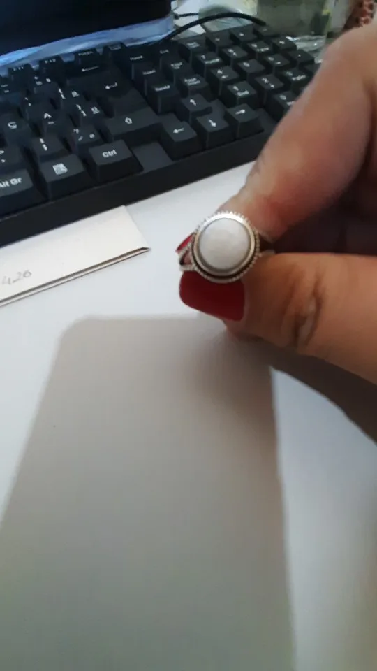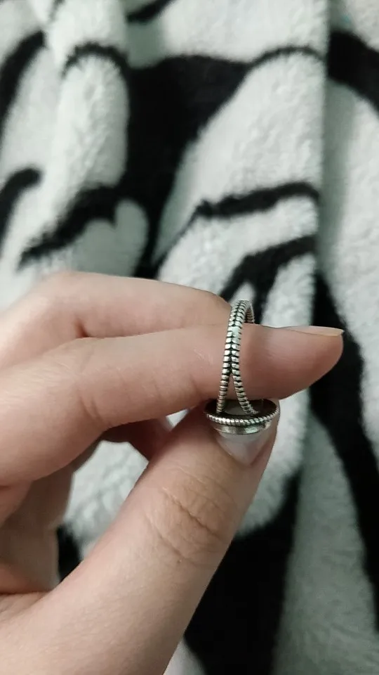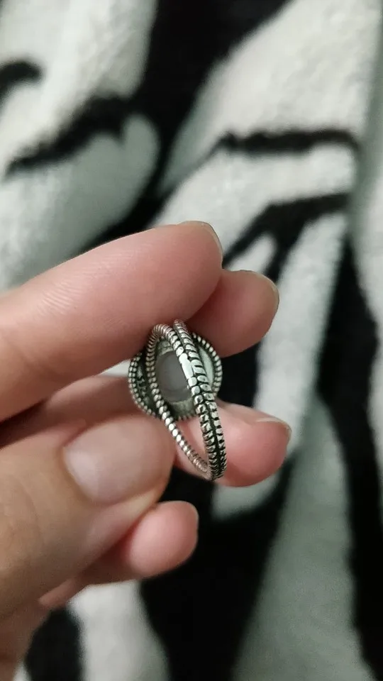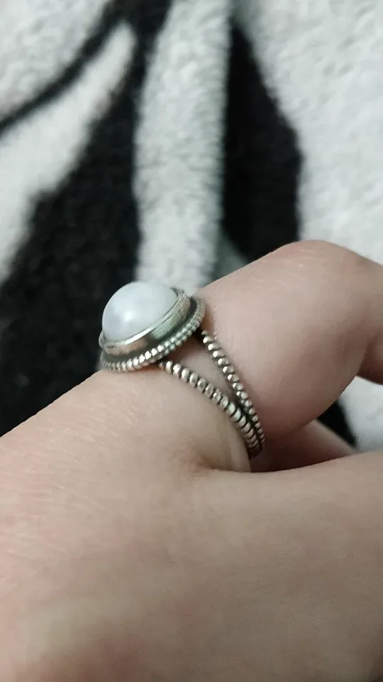 кольцо очень лёгкое и при соприкосновения с другими украшениями не очень звонкое - не серебро. камень красивый, но на клею и видны следы, плюс есть пара косяков по исполнению. но самый трэш в том, что оно в реале выглядит как "бабкино"..