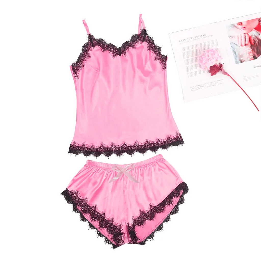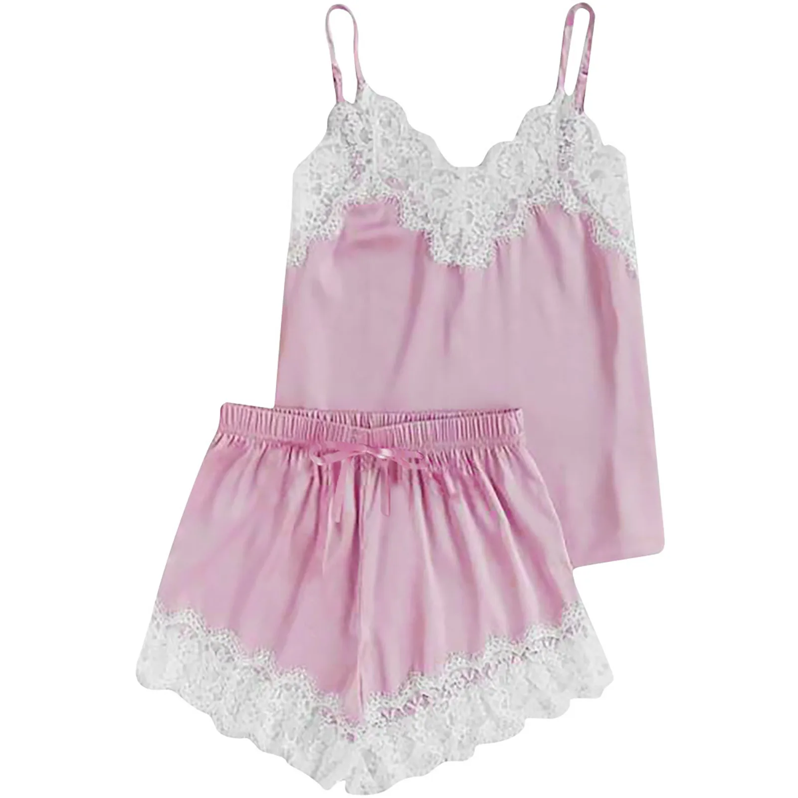 Женская пикантная Пижама, однотонный пижамный комплект, Черная кружевная Пижама без рукавов с V-образным вырезом, милые атласные топы и шорты, пижама Mujer Algodon
