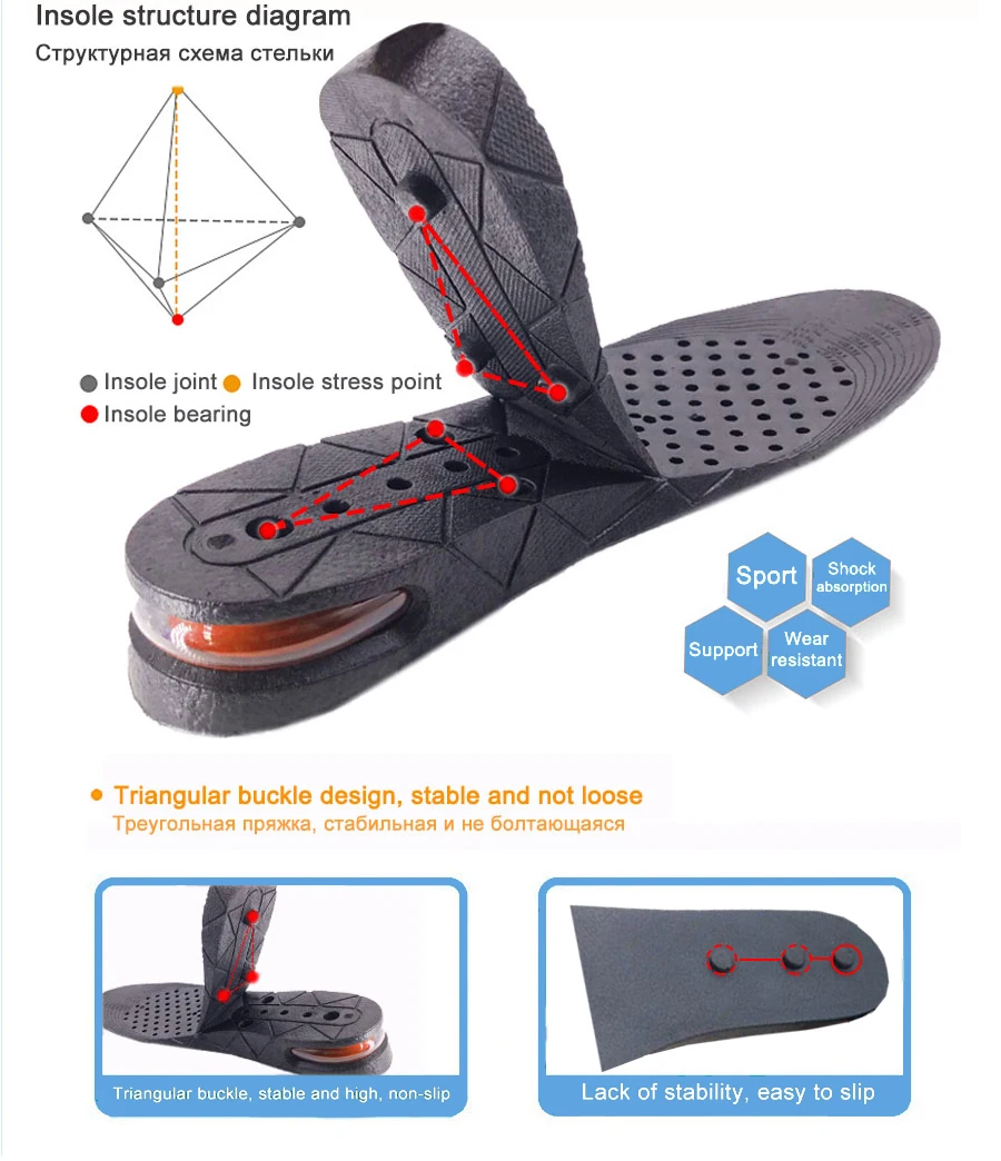Очень классная штука. Ноге удобно, мягко, реально круто работает. Но больше одной доп стельки воткнуть сложно, основная+1доп влезли только в высокие кеды. Но и 5 см - это ооочень крутое повышение роста, конечно.
