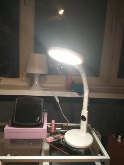 Спасибо большое! Лампа очень хорошая! Легко регулируется положение лампы, свет можно сделать приглушённым или увеличить его яркость (4 ступени от тусклого до самого яркого). Также настраивается тёплый свет, холодный, дневной. Продавец отвечает на все вопросы. Приобретайте!