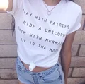 Женская футболка с изображением единорога с русалками, летящими на луну, сексуальные топы, модные летние футболки в стиле Харадзюку USD 9,20/Шт.