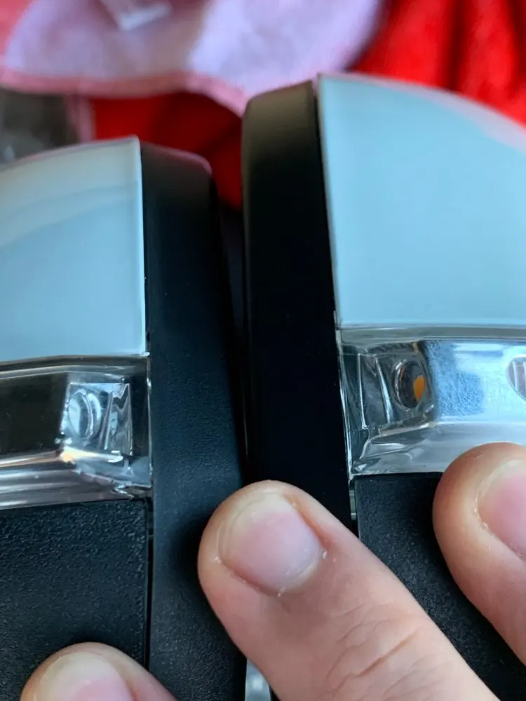 Два зеркала поставляются со светодиодными лампами от разных производителей. Разница минимальна, но видна. В целом качество нормальное, но четко не оригинальное. Зеркала бокового вида не полностью плоские, отражение немного волнистое. Крепление зеркального элемента более шаткое, чем OEM, трясется во время вождения немного.