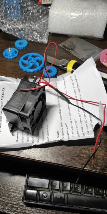 греет хорошо, вентилятор тихий взял себе для активной термокамеры принтера, посмотрим как греть будет. для тех кто задаёт вопрос про 3 провода, там только из нагревателя выходит 3, потом 2 соединяются и на питание идёт уже 2.