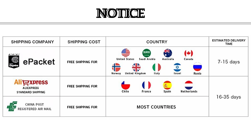 Если вы хотите изменить адрес доставки, напишите нам по электронной почте ПЕРЕД оплатой. Почта Китая можно отслеживать заказную авиапочту, Epacket и стандартную доставку Aliexpress. Время доставки во время праздников (Рождество, китайский Новый год и т. д.) может быть дольше, чем обычно. Пожалуйста, добавьте еще 5–10 дней задержки.
