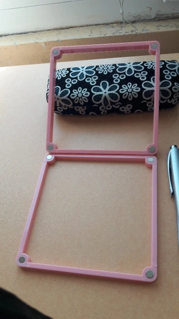 Размер внутренней рамки 11*11 см, в деле еще не пробовала, высота половинок у нее разная, но магнит держит хорошо.