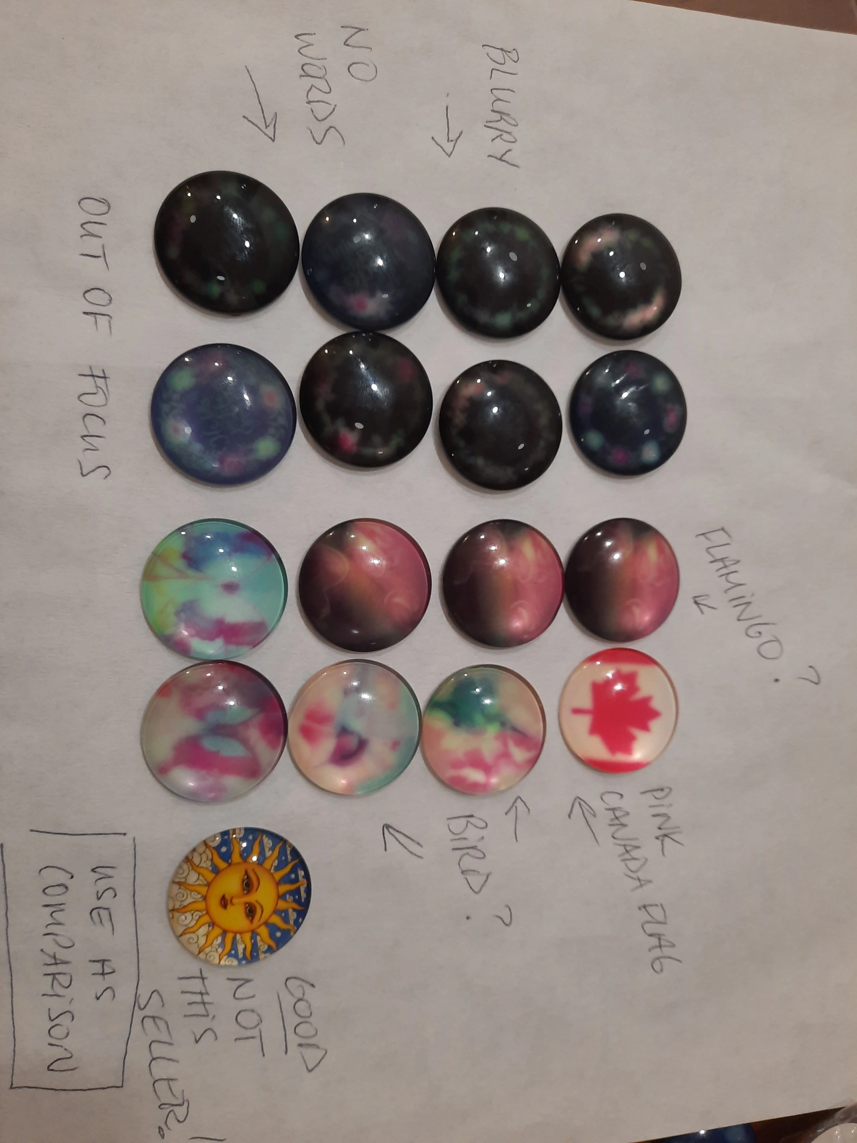 Этот продукт является абсолютным мусором. Товар не соответствует описанию. Художественное оформление темное и размытое. Я не могу прочитать слова. Я не знаю, на что смотреть. Как они могут продавать этот мусор и ожидать от клиента его принять? На картинке, которую я отправил. Ряд 1: темные круги должны быть библейскими цитатами с яркими цветами. Это черный размытый круг, без слов. Не покупайте Библейские Серия 2: розовый размытый кабошон должен быть фламинго. Фламинго отсутствует. Не покупайте фламинго Ряд 3: кабошон птицы должен быть колибри. Размытый и тусклый. Не покупайте колибри Ряд 3: то же самое с бабочкой. Не покупайте бабочки Ряд 3: флаг Канады не является средним и розовым (не красным). Не покупайте флаги Я отправил еще один стеклянный камень (солнце) от другого продавца, чтобы показать ясность, чтобы показать, что этот плохой продукт находится вне фокуса (а не моя камера). Используйте в качестве сравнения или Посмотрите на их размещение и сравните с этим.