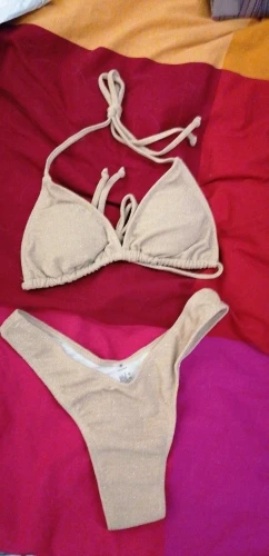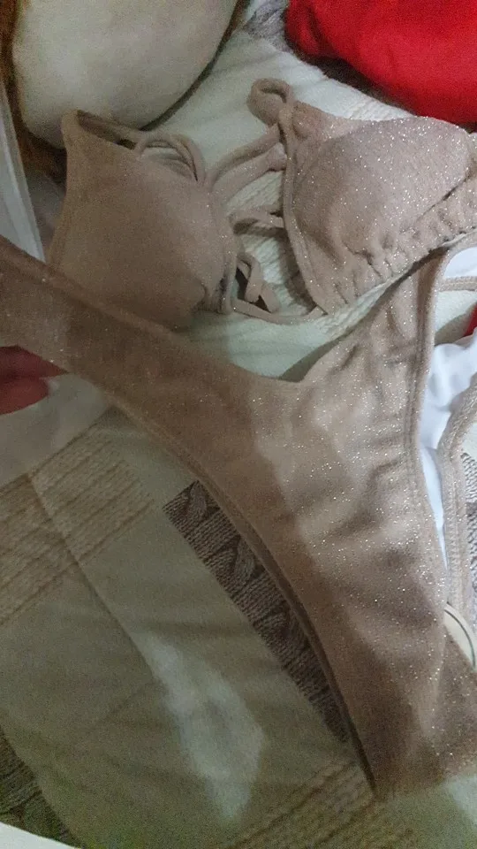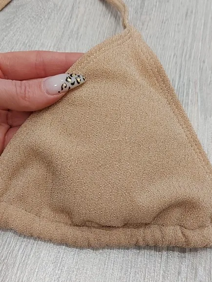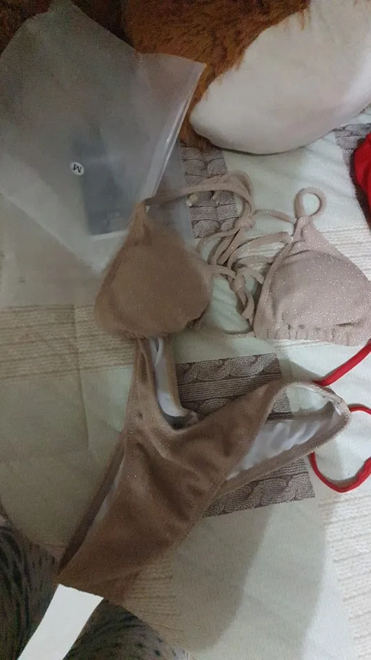 Купальник полностью соответствует фото. Ткань рельефная с люрексом, имеет деликатное сверкание. Не выглядит дёшево! Как и положено с защитной наклейкой на трусиках) Как и все купальники на Али, маломерит на размер. Ношу М, заказала L. Спасибо продавцу за подарочек.