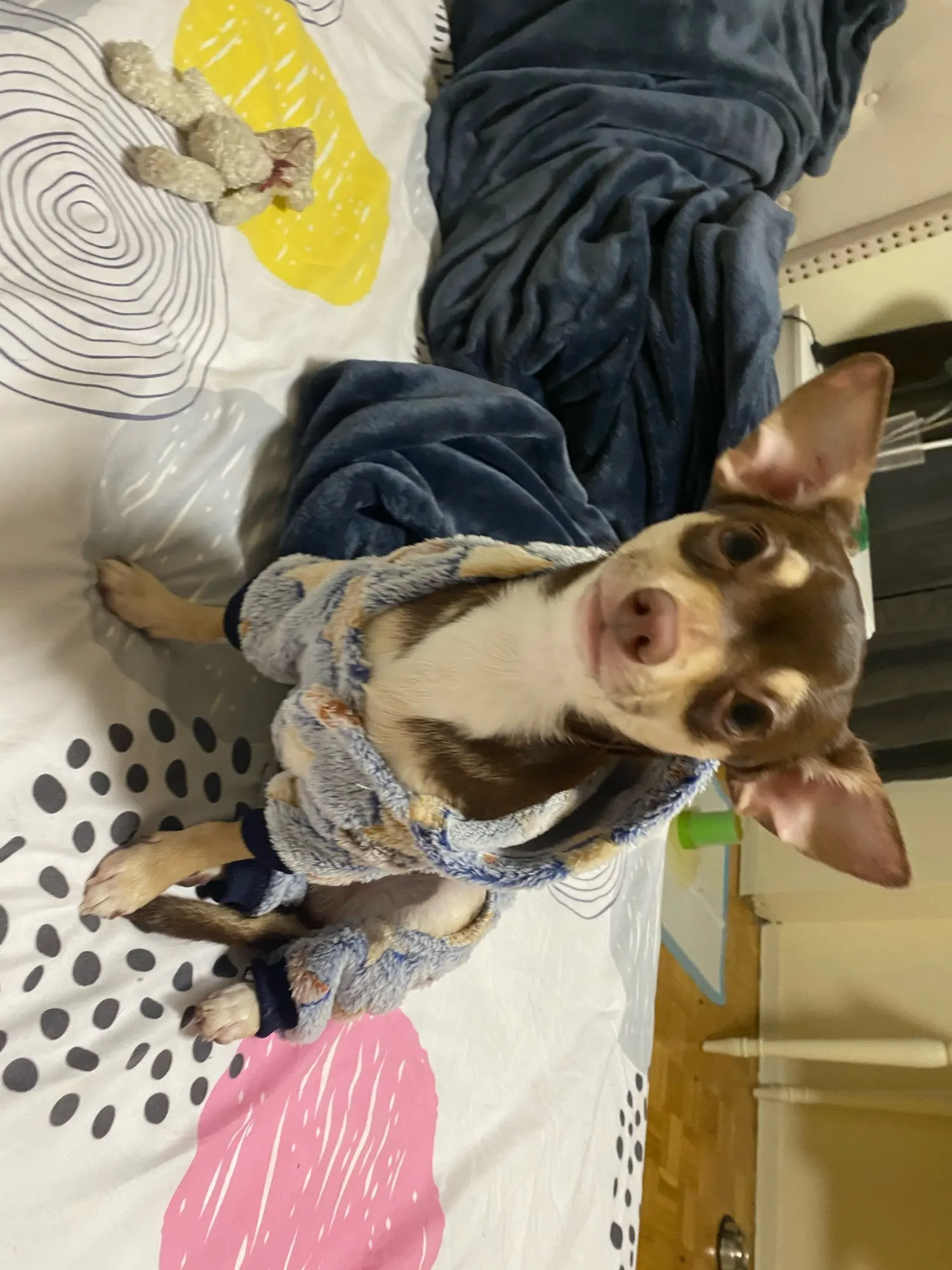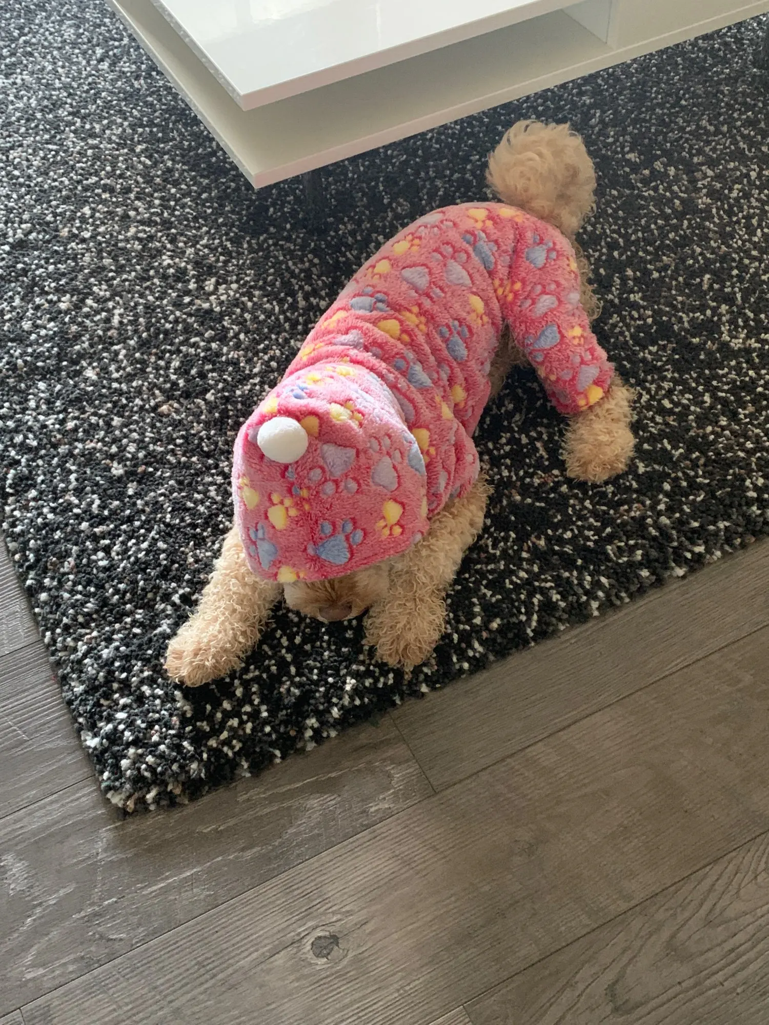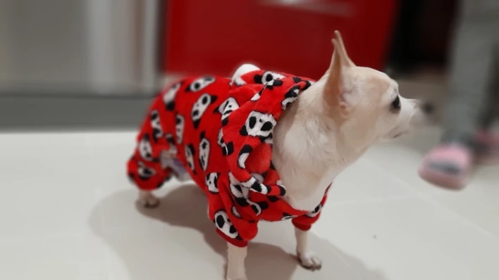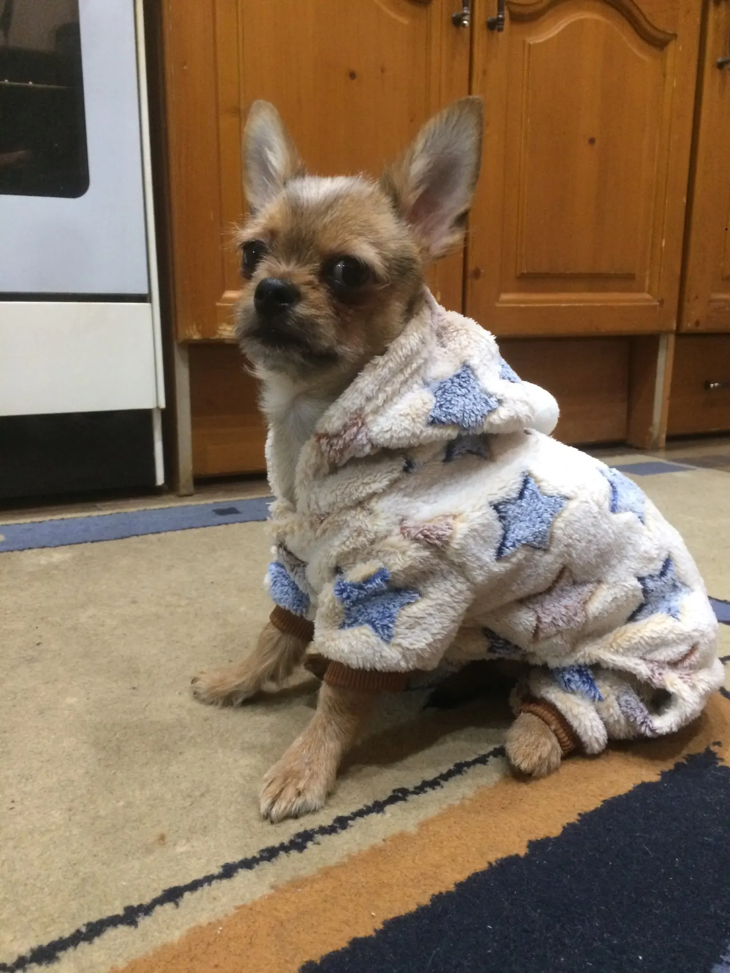Первый раз такая быстрая доставка-3 недели. Костюм тёплый, приятный на ощупь, без запаха. На тойтерьер 3 кг М села впритык, задние лапы чуть давит.