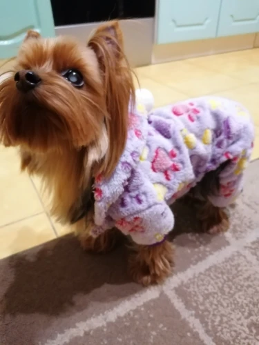 Костюм пришёл очень быстро. Мягкий и тёплый. На Йорка 2,5 кг подошёл размер М