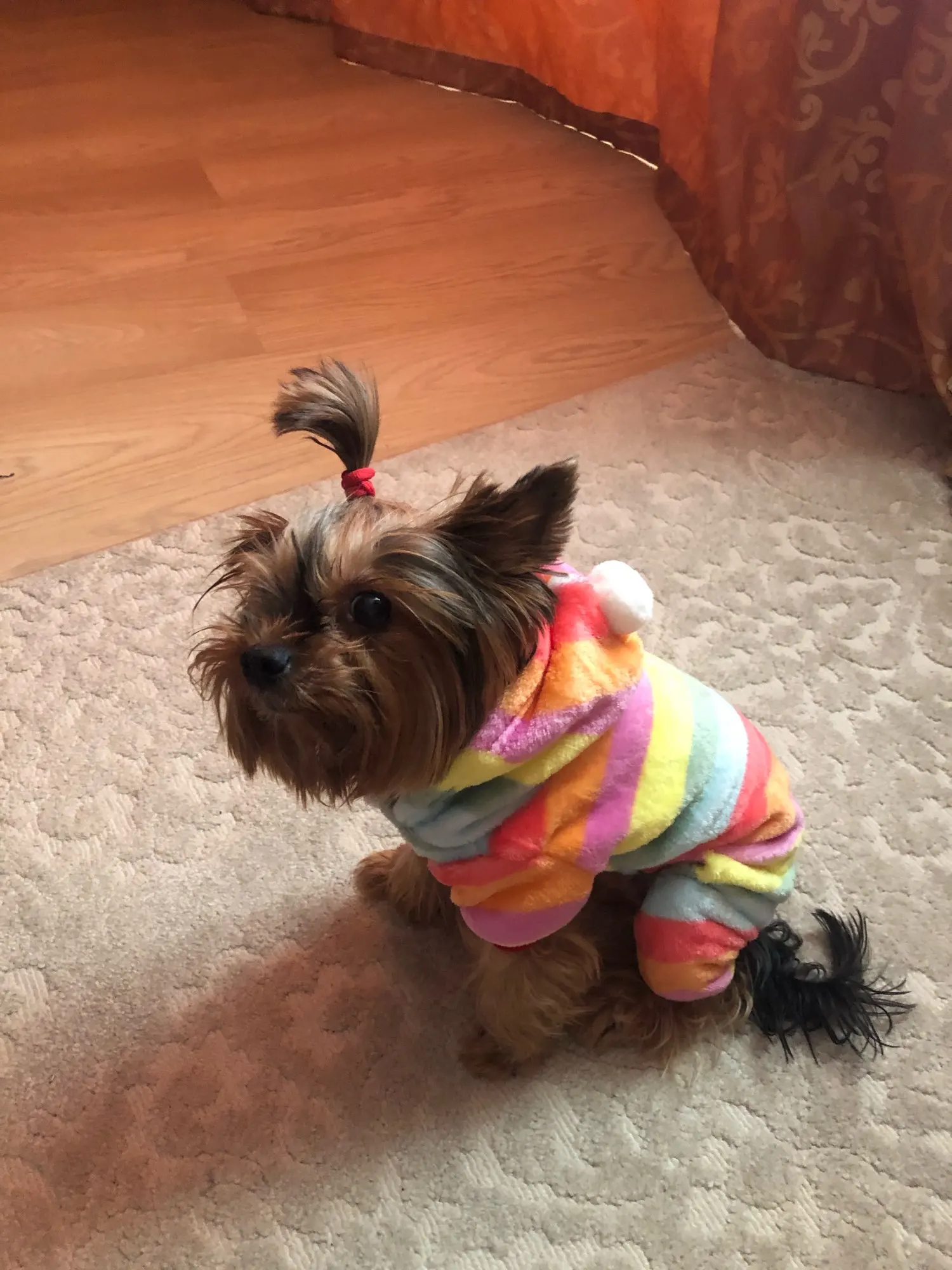 На йорка 3 кг село хорошо. Капюшон тяжеловат, постоянно в бок спадает. На ощупь очень приятное.