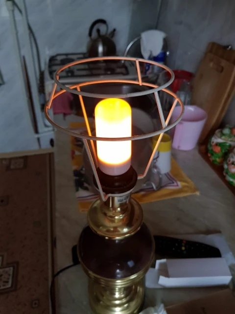 Лампочка полностью соответствует описанию, наконец смогла проверить работу. Мерцает как пламя и в принципе смотрится красиво, но все же ожидала большего подобия огню.